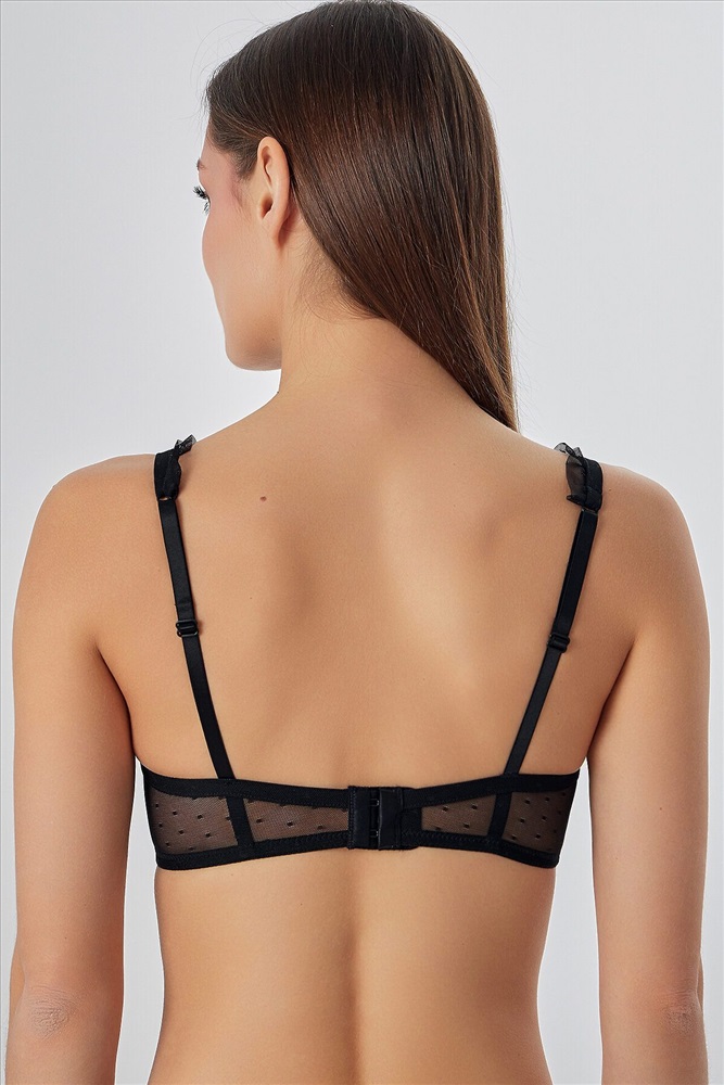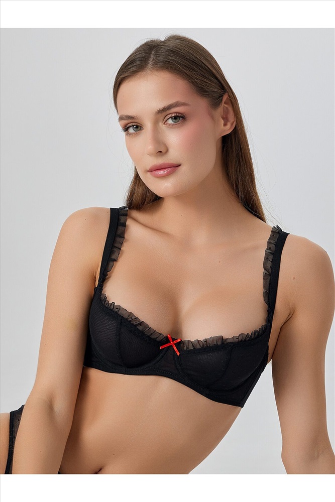 Бюстгальтер женский с мягкими чашками, на стане, на 2и 50 типах каркаса, выполнен из эластичной сетки. Чашки с двойным членением и на подкладке из сетки. По верхнему срезу чашки и на участке бретели выполнена рюша из сетки с сырым краем и со сборкой по срезу притачивания. По шву притачивания рюши на участке чашки стоит эл тесьма 8 мм (жилка тканая Wt4-8, девсел 13460W). Верхний срез стана, пройма чашки и рюша окантованы бейкой из сетки с эластичной тесьмой 10 мм (жесткая без/зуба WTWE1-10, девсел 487W) внутри. Нижний срез стана обработан в два приема эл тесьмой 10 мм (жесткая без/зуба WTWE1-10, девсел 487W). Ластовица и деталь стана на подкладке из монокапрона. Бочки отрезные, в бочках пластины. Бретель регулируемая 10мм и 15мм (SWE3, девсел 1979W) по размерам. Пластиковые кольца-регуляторы 10 мм и 15 мм по размерам. Застежка крючки-петли по размерам: двойная 38 мм и тройная 57 мм. Бантик по центру по верхнему срезу ластовицы.