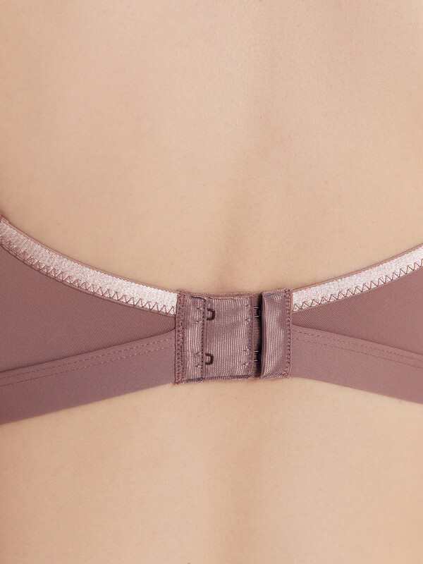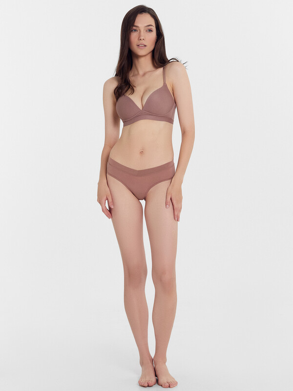 Бюстгальтер с мягкой подформовкой на жестких формованных чашках, без каркаса. Ластовица цельная с деталью стана на подкладке из микрофибры. Пластины в бок. деталях стана. Верхний срез стана обработан тесьмой. Нижний срез стана обработан окантовкой с внутренней тесьмой. Бретели. Кольца и регуляторы. Застежка двойная