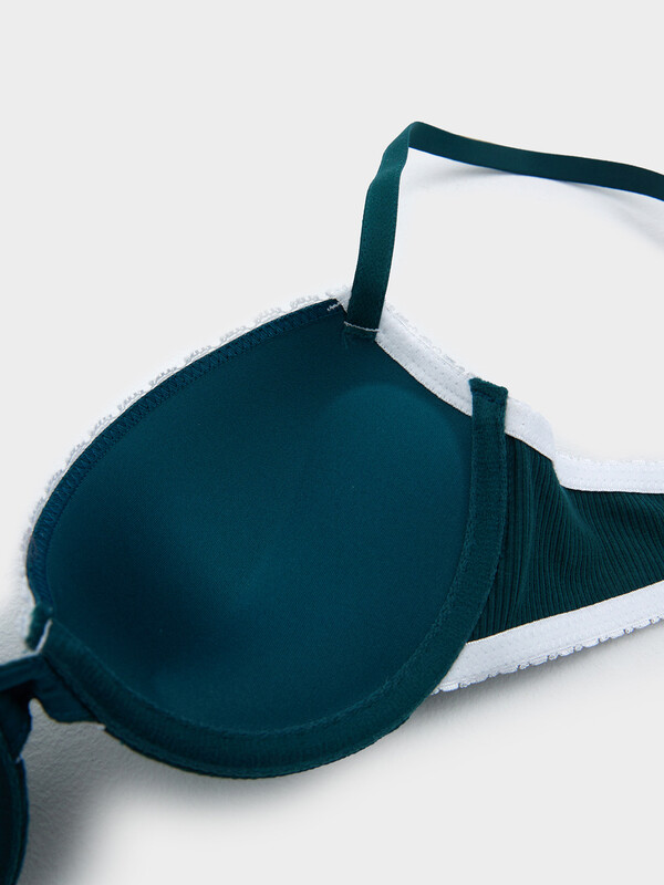 Бюстгальтер с жесткой формованной чашкой пуш-ап с вытачкой, выполнен из рибаны, каркас. Верхний срез чашки обработан узк. кружевом. Срезы проймы и стана обработаны тесьмой без зуба. Бретели. Кольца и регуляторы. Застежка двойная.