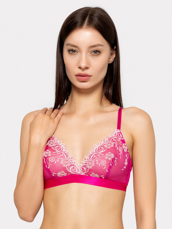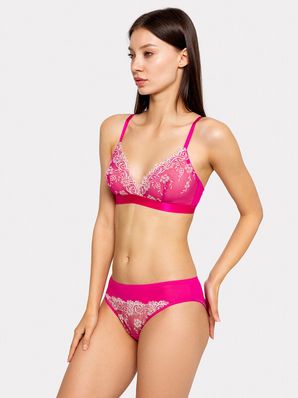 Бюстгальтер женский. Без каркасов. Бочки из сетки (в два слоя). Чашки из вышивки, с вытачками, на подкладке из сетки. Пройма и верхний срез стана обработаны тесьмой жесткой без зуба. Нижний срез стана обработан глянцевой жаккардовой тесьмой. Застежка двойная. В боковых швах пластины. По краю вышивки силиконовая тесьма. Бретели.