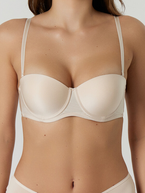 Бюстгальтер с жесткими формованными чашками BN-58, на каркасах 73 тип, выполнен из микрофибры. Чашки обтянуты подформованной микрофиброй. Верхний срез чашки обтачной, на припуске закреплена петля для съемных бретелей. Ластовица и деталь стана на подкладке из монокапрона арт р441. Бочок цельнокроенный с деталью стана. На бочке обработаны пластины. Проймы и нижний срез обработаны эластичной тесьмой 12 мм (жесткая без/зуба WTWE1-12 с силиконом, девсел 487W-12Si) с силиконом в два приема.