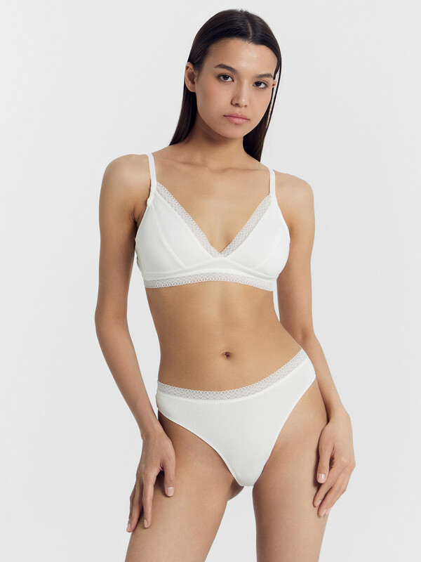 Бюстгальтер с мягкими чашками, без каркасов. Чашки выполнены из хлопка, на подкладке из хлопка. Чашки с вертикальным членением. Передний срез чашек декорирован тесьмой. Ластовица выполнена из хлопка на подкладке из хлопка. Все детали подкладки идут рисунком к телу. Отрезные бочки из хлопка. В боковых швах пластины. Верхний срез бочка и проймы обработан жесткой тесьмой.. По нижнему среза стана настрочена декоративная тесьма с жесткой тесьмой с изнаночной стороны. Бретель с регулировкой. Застежка двойная