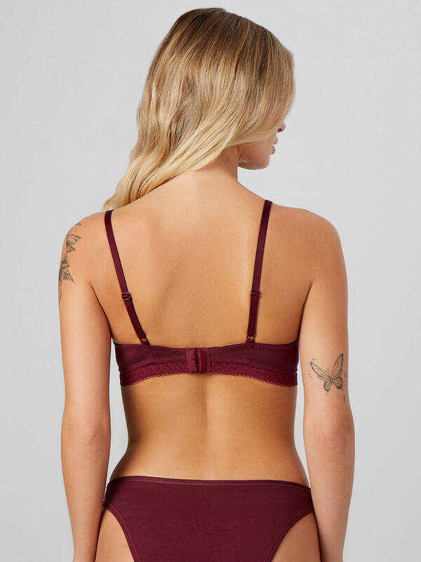 Бюстгальтер с мягкими чашками, без каркасов. Чашки выполнены из хлопка, на подкладке из хлопка. Чашки с вертикальным членением. Передний срез чашек декорирован тесьмой. Ластовица выполнена из хлопка на подкладке из хлопка. Все детали подкладки идут рисунком к телу. Отрезные бочки из хлопка. В боковых швах пластины. Верхний срез бочка и проймы обработан жесткой тесьмой.. По нижнему среза стана настрочена декоративная тесьма с жесткой тесьмой с изнаночной стороны. Бретель с регулировкой. Застежка двойная