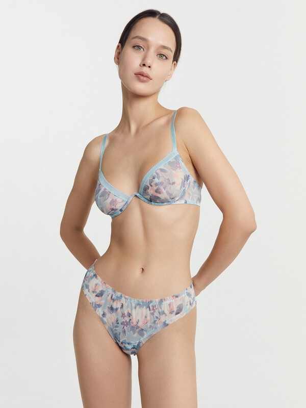 Бюстгальтер женский с мягкими чашками, на монокаркасе. Чашки с вертикальным рельефом. Верхний срез чашки обработан декоративной эластичной тесьмой. Бочки из эластичной сетки.