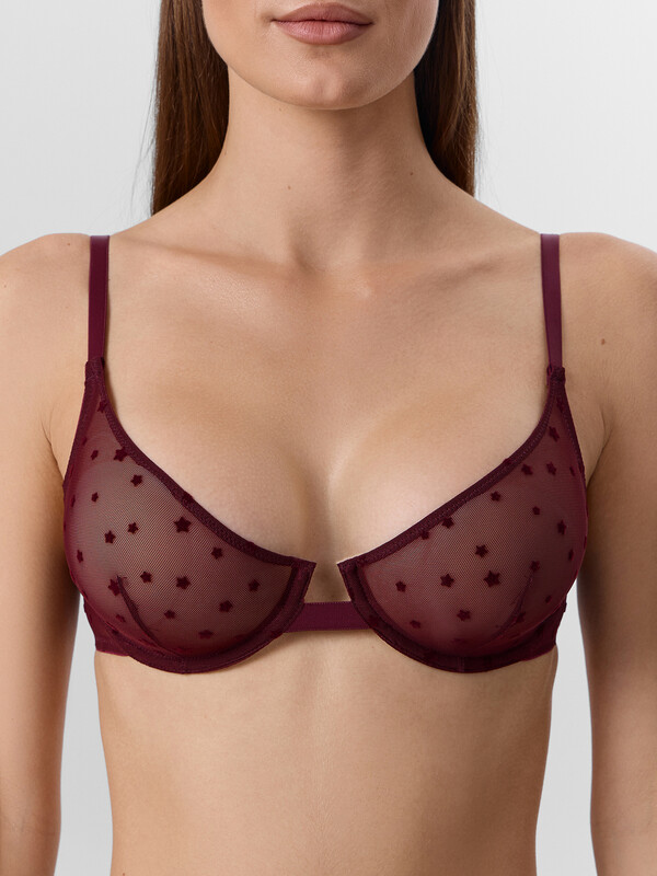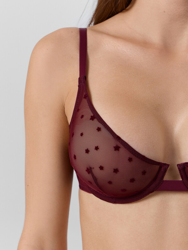 Бюстгальтер женский с мягкой чашкой, на каркасах, из эластичной сетки с флоком. Чашка с вытачкой, с выступом. Верхний срез чашки обработан швом вподгибку с эластичной тесьмой внутри. Ластовица выполнена из бретельной тесьмы 15 мм (SWE3-15). Пройма, верхний и нижний срезы стана обработаны в два приема эластичной тесьмой.