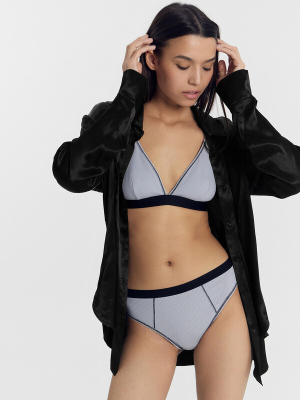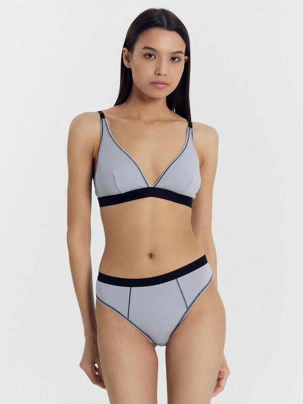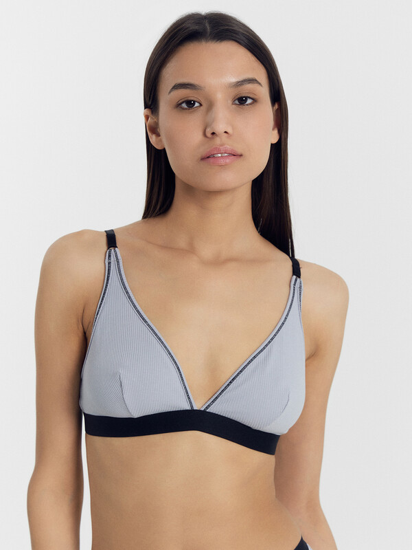 Бюстгальтер с мягкими треугольными чашками, без каркасов, выполнен из трикотажного полотна рибана. Чашка с вытачкой, на подкладке из трикотажного кулирного полотна. Верхний срез, срез проймы и верхний срез бочка окантованы бейкой из основного полотна с эластичной тесьмой внутри с отделочной строчкой с верхним застилом.