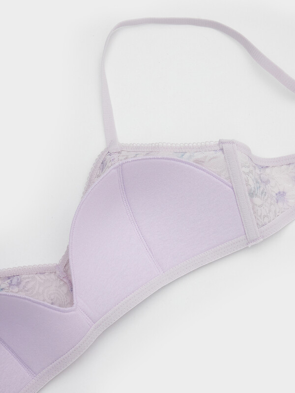Бюстгальтер женский с мягкими чашками, без каркасов, из кружевного полотна. Чашка с вертикальным рельефом, на подкладке из дубляжа. Верхний срез чашки обработан эластичной тесьмой в 2 приема по размерам. Подкладка чашки выполнена из дубляжа с рельефами. В бочках пластины.