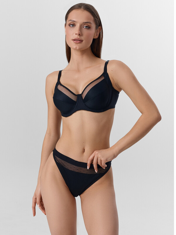 Чашка с тройным членением из трикотажного неэластичного полотна арт 440 (гладкий), с отделкой сеткой арт 480В. Верхний срез чашки окантован эл тесьмой 15 мм (ловабль F1-15). Боковая корректирующая деталь с уплотнителем из монокапрона в верхней части.