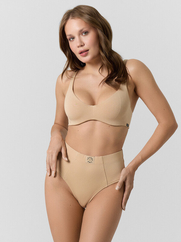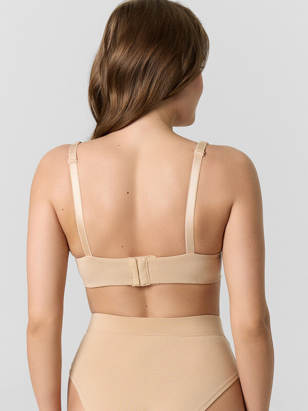 Чашка двухслойная: верхний и нижний слои из кулирного полотна, которые подформованы. Чашка с цельнокроенной частью бретели, переходящей на спинку. Верхний срез чашки обтачан подкладкой с прокладыванием эластичной тесьмы 6 мм (жилка WT4-6, devsel 13460W) внутри по шву. Боковой срез чашки обтачан подкладкой с прокладыванием эластичной тесьмы 8 мм (жесткая б/зуба WTWE1-8, Devsel 487W) внутри.