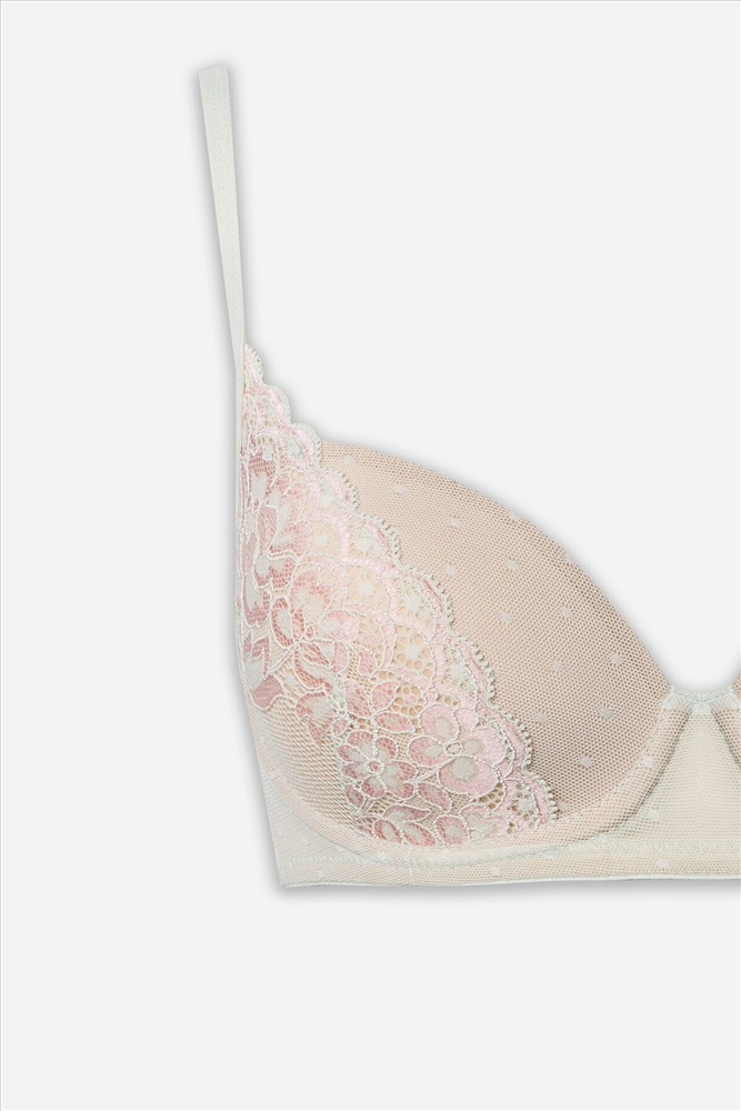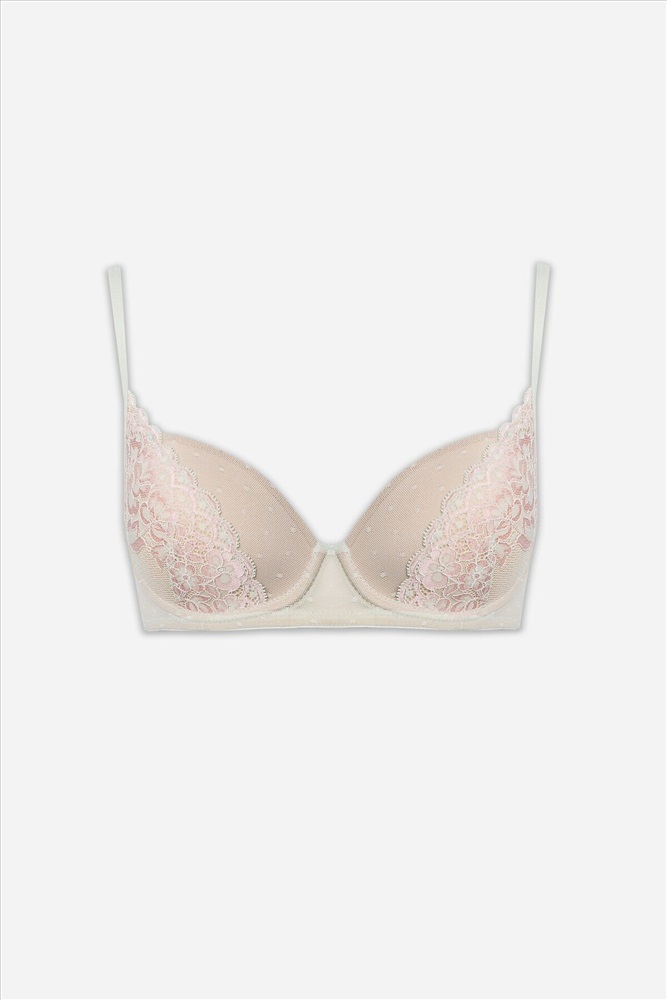 Бюстгальтер женский тишот, с формованными чашками (CN-53.16), на каркасах (тип2). Выполнен из кружевного полотна и широкого эластичного кружева (Femina арт. 3EG052, код L99-22.3), чашки с вытачками с надставками внутри из монокапрона. Ластовица и стан на подкладке из монокапрона. Отрезные бочки из кружевного полотна с вставленными пластинами. Срезы проймы окантованы бейкой из кружевного полотна с эл тесьмой внутри 10 мм (жесткая WTWE1-10, arteks E7185), переходящей в бретель. Нижний срез обработан эл тесьмой 12 мм (жесткая WTWE1-12, arteks E7185). Бретели 10мм (Devsel 1979W, SWE3-10), кольца регуляторы 10мм - металл. Застежка двойная 28мм.