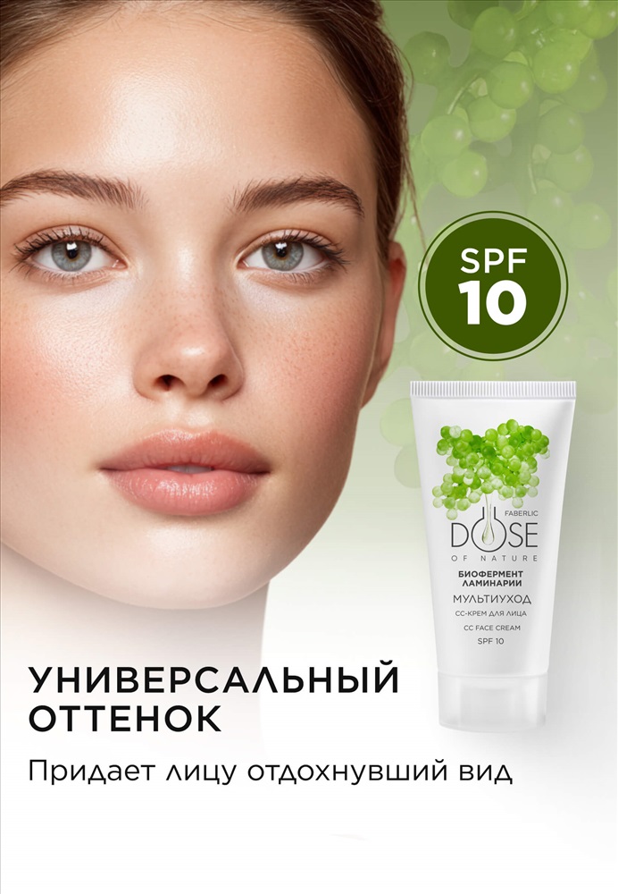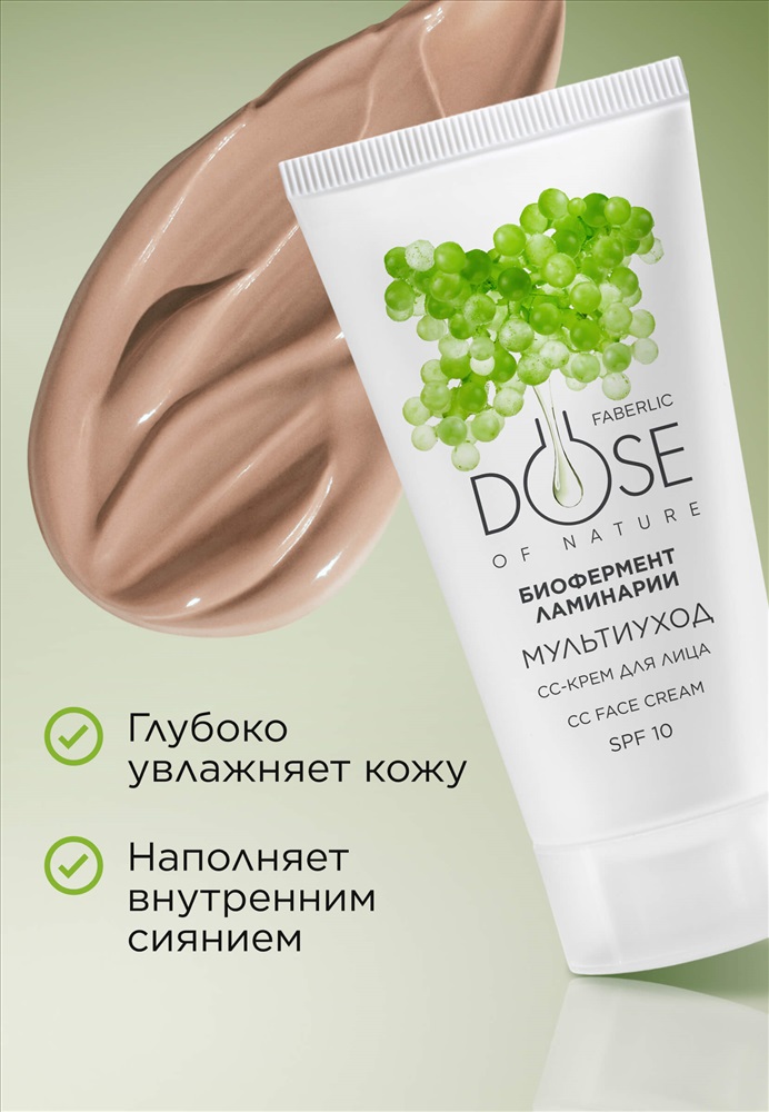 Объем: 30 мл Dose of Nature – это энергия растений для красоты кожи! Средства созданы специально для ежедневного ухода за кожей на основе уникальных натуральных экстрактов, усиленных природными биоферментами. CC-крем для лица SPF 10 «Мультиуход» создает идеальный тон и наполняет кожу внутренним сиянием.