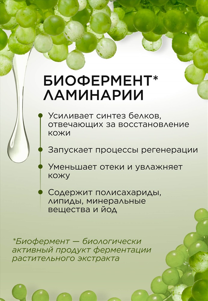 Биофермент* ламинарии усиливает синтез белков, отвечающих за восстановление кожи, запускает процессы регенерации. Уменьшает отеки и увлажняет кожу. Содержит полисахариды (альгиновую кислоту, маннит, фукоидан, ламинаран), липиды, минеральные вещества (хром, медь, кобальт, железо, магний, кальций, калий, цинк), йод. Витамин E обеспечивает антиоксидантный эффект, предотвращая преждевременное старение. *Биофермент – биологически активный продукт ферментации растительного экстракта.
