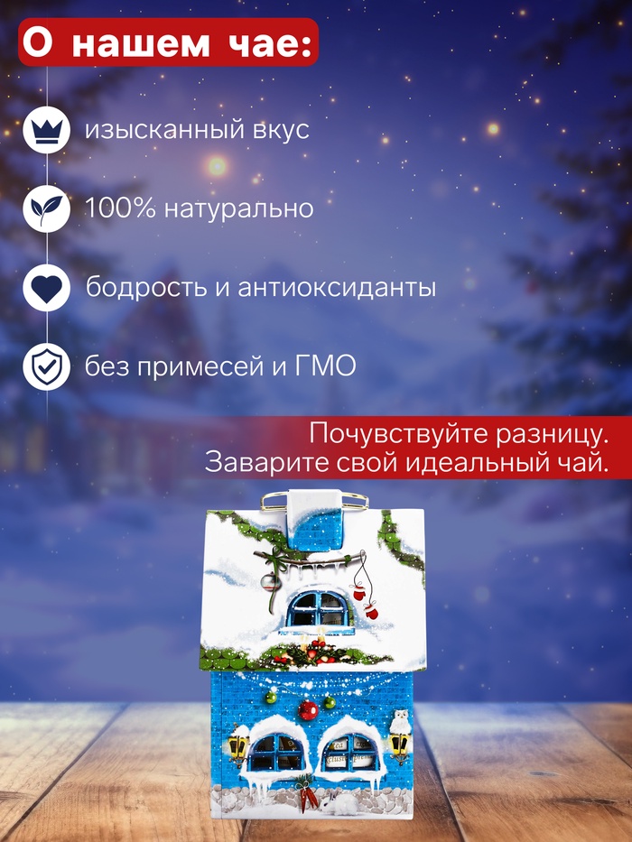 Праздник в каждой детали! Новогодний чай в домике-подсвечнике — это чёрный чай в картонной упаковке, которая становится элементом праздничного декора. Набор объединяет вкусный напиток и уютный аксессуар для создания зимней атмосферы.