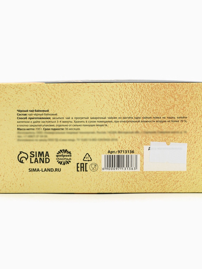 Габариты: 14,5 x 6,5 x 18,5 Страна: Россия В боксе: 84 шт Состав: См. на упаковке Материалы: см. на упаковке Фасовка: по 1 шт Индивидуальная упаковка: Термоусадочная пленка Сертификат: ЕАС Набор: Нет Для кого: Унисекс В наборе, шт.: 1 Вес нетто, г: 100 Фасовка: Весовой Вид чая: Чёрный Вид упаковки: Подарочная коробка Символ года: Нет Тематика праздника: Новый год Адресат: Без адресата Вкус: Без вкуса Подарочный чай: Да Составляющие набора: Чай Добавки чая: Без добавок Вид упаковки: В картонной коробке При оформление заказа, просим запрашивать актуальные сроки годности у менеджераСостав: чай чёрный байховый. Способ приготовления: засыпьте чай в прогретый заварочный чайник из расчёта одна чайная ложка на чашку, залейте кипятком и дайте настояться 3-4 минуты. Срок годности: 36 месяцев Масса нетто: 100 г. Комментарии к товару
