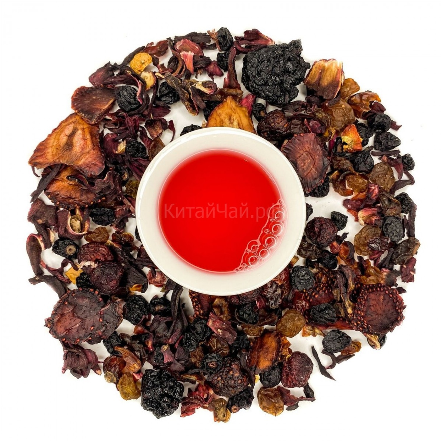 Гибискус, смородина, малина, ежевика, клюква, листья земляники, изюм, шиповник, клубника. Ароматизирован натуральными маслами.