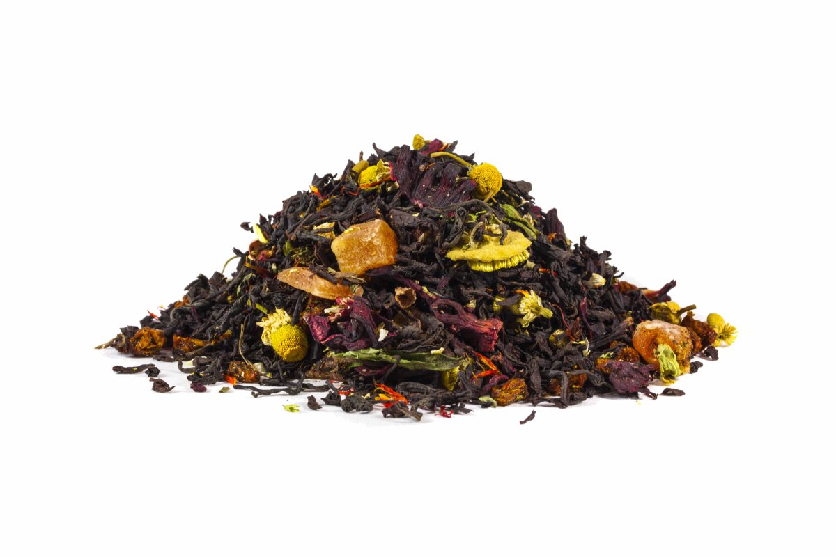 Чёрный чай с гибискусом, листьями стевии, ягодами облепихи, цветками ромашки, лепестками сафлора и кусочками папайи. Без ароматизаторов.