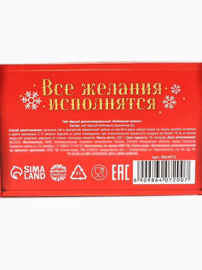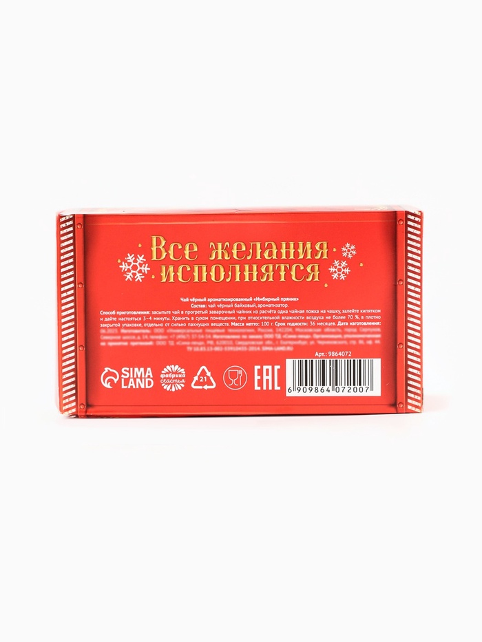 Габариты: 5 x 8 x 15 Страна: Россия В боксе: 146 шт Состав: См. на упаковке Материалы: см. на упаковке Фасовка: по 1 шт Индивидуальная упаковка: Термоусадочная пленка Сертификат: ЕАС Набор: Да Вес нетто, г: 100 Фасовка: Весовой Вид чая: Чёрный Символ года: Нет Тематика праздника: Новый год Вкус: Имбирный пряник Подарочный чай: Да Добавки чая: Ароматизатор Вид упаковки: В картонной коробке Фиксированная цена: Да При оформление заказа, просим запрашивать актуальные сроки годности у менеджераСостав: чай чёрный байховый, ароматизатор. Способ приготовления: засыпьте чай в прогретый заварочный чайник, из расчёта одна чайная ложка на чашку, залейте кипятком и дайте настояться 3-4 минуты. Срок годности: 36 месяцев Масса нетто: 100 г. Комментарии к товару