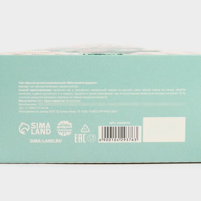 Габариты: 18,5 x 14,5 x 6,5 Страна: Россия В боксе: 84 шт Состав: См. на упаковке Материалы: см. на упаковке Фасовка: по 1 шт Индивидуальная упаковка: Термоусадочная пленка Сертификат: ЕАС Набор: Нет Вес нетто, г: 100 Фасовка: Весовой Вид чая: Чёрный Символ года: Нет Тематика праздника: Новый год Вкус: Яблочный штрудель Подарочный чай: Да Добавки чая: Ароматизатор Вид упаковки: В картонной коробке При оформление заказа, просим запрашивать актуальные сроки годности у менеджераСостав: чай чёрный байховый. Способ приготовления: засыпьте чай в прогретый заварочный чайник из расчёта одна чайная ложка на чашку, залейте кипятком и дайте настояться 3–4 минуты. Хранить в сухом помещении, при относительной влажности воздуха не более 70 %, в плотно закрытой упаковке, отдельно от сильно пахнущих веществ. Масса нетто: 100 г. Срок годности: 36 месяцев. Комментарии к товару