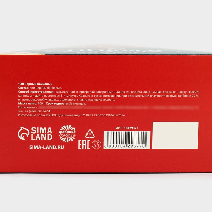 Габариты: 17,5 x 14,5 x 6,5 Страна: Россия В боксе: 85 шт Состав: См. на упаковке Материалы: см. на упаковке Фасовка: по 1 шт Индивидуальная упаковка: Термоусадочная пленка Сертификат: ЕАС Набор: Нет Вес нетто, г: 100 Фасовка: Весовой Вид чая: Чёрный Символ года: Нет Тематика праздника: Новый год Подарочный чай: Да Добавки чая: Без добавок Вид упаковки: В картонной коробке При оформление заказа, просим запрашивать актуальные сроки годности у менеджераСостав: чай чёрный байховый, ароматизатор. Способ приготовления: засыпьте чай в прогретый заварочный чайник из расчёта одна чайная ложка на чашку, залейте кипятком и дайте настояться 3–4 минуты. Хранить в сухом помещении, при относительной влажности воздуха не более 70 %, в плотно закрытой упаковке, отдельно от сильно пахнущих веществ. Масса нетто: 100 г Срок годности: 36 месяцев. Комментарии к товару