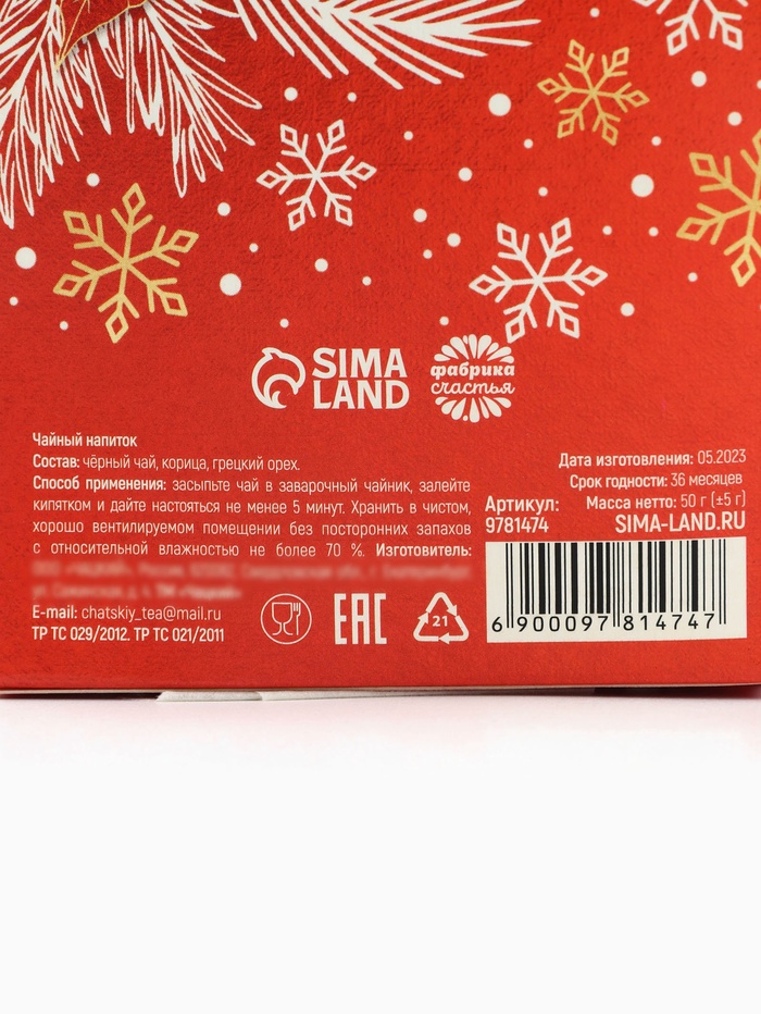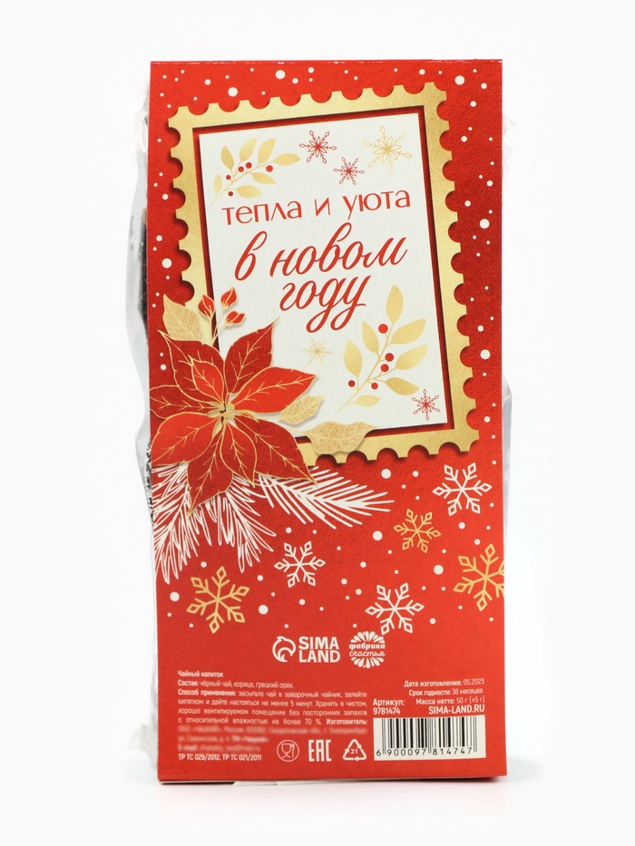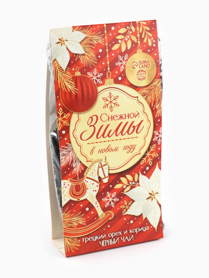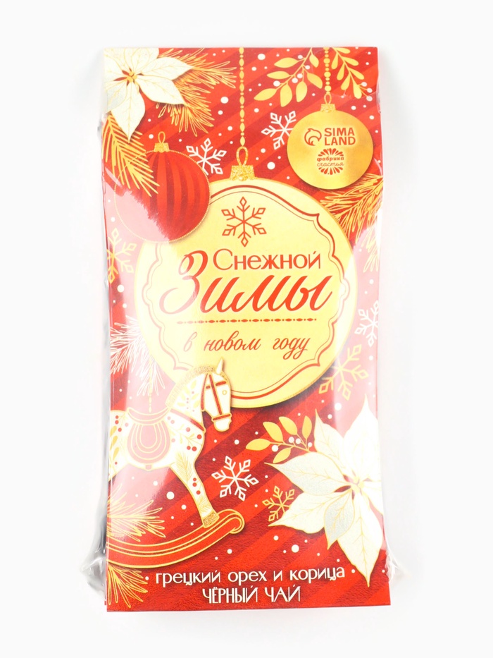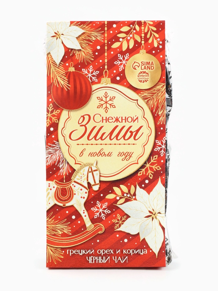 Габариты: 8 x 2,5 x 16,5 Страна: Россия В боксе: 240 шт Состав: См. на упаковке Материалы: см. на упаковке Фасовка: по 1 шт Индивидуальная упаковка: Пакет (БОПП, полиэтилен, ПВХ, дой-пак) Сертификат: ЕАС Набор: Нет Вес нетто, г: 50 Фасовка: Весовой Вид чая: Чёрный Символ года: Символ года 2026 (Лошадь) Тематика праздника: Новый год Вкус: Грецкий орех, Корица Подарочный чай: Да Добавки чая: Грецкий орех, Корица Вид упаковки: В картонной коробке Фиксированная цена: Да ПРИ ОФОРМЛЕНИИ ЗАКАЗА, ПРОСИМ ЗАПРАШИВАТЬ АКТУАЛЬНЫЕ СРОКИ ГОДНОСТИ У МЕНЕДЖЕРА >Состав: чай чёрный, корица, грецкий орех. Способ применения: засыпьте чай в заварочный чайник, залейте кипятком и дайте настояться не менее 5 минут. Срок годности: 36 месяцев Масса нетто: 50 г (± 5 г). Комментарии к товару