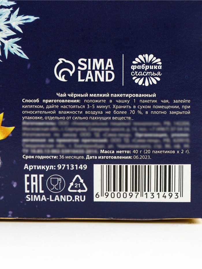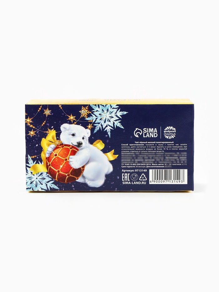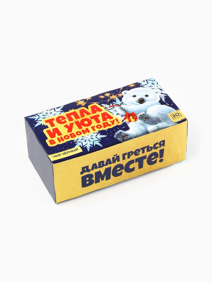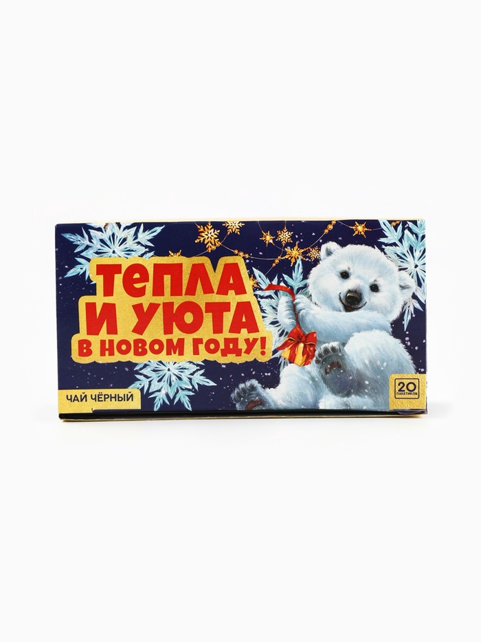 Габариты: 7,2 x 13,5 x 5 Страна: Россия В боксе: 24 шт Состав: См. на упаковке Материалы: см. на упаковке Фасовка: по 1 шт Индивидуальная упаковка: Термоусадочная пленка Сертификат: ЕАС Набор: Нет Вес нетто, г: 40 Фасовка: Пакетированный Вид чая: Чёрный Символ года: Нет Тематика праздника: Новый год Подарочный чай: Да Добавки чая: Без добавок Вид: Без ярлычка Фиксированная цена: Да При оформление заказа, просим запрашивать актуальные сроки годности у менеджераСостав: чай чёрный Способ приготовления: положите в чашку 1 пакетик чая, залейте кипятком, дайте настояться 3-5 минут. Срок годности: 36 месяцев Масса нетто: 40 г (20 пакетиков х 2 г). Комментарии к товару