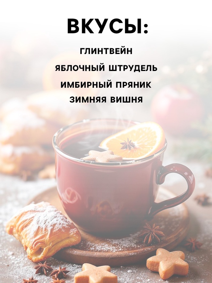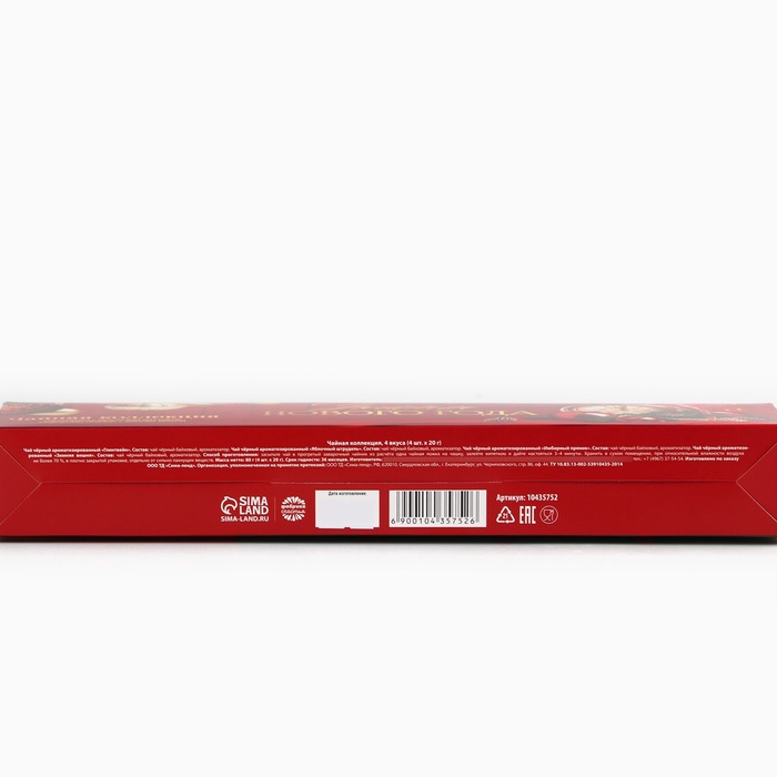 Габариты: 31,7 x 13,7 x 4,5 Страна: Россия В боксе: 45 набор Состав: См. на упаковке Материалы: см. на упаковке Фасовка: по 1 набор Индивидуальная упаковка: Термоусадочная пленка Сертификат: ЕАС Набор: Нет Вес нетто, г: 80 Фасовка: Весовой Вид чая: Чёрный Символ года: Нет Тематика праздника: Новый год Вкус: Ассорти Подарочный чай: Да Добавки чая: Ароматизатор Вид упаковки: В картонной коробке ПРИ ОФОРМЛЕНИИ ЗАКАЗА, ПРОСИМ ЗАПРАШИВАТЬ АКТУАЛЬНЫЕ СРОКИ ГОДНОСТИ У МЕНЕДЖЕРА Чай чёрный "Глинтвейн" Состав: чай чёрный байховый, ароматизатор. Чай чёрный "Яблочный штрудель". Состав: чай чёрный байховый, ароматизатор. Чай чёрный "Имбирный пряник" Состав: чай чёрный байховый, ароматизатор. Чай чёрный "Зимняя вишня" Состав: чай чёрный байховый, ароматизатор. Способ приготовления: засыпьте чай в прогретый заварочный чайник из расчёта одна чайная ложка на чашку, залейте кипятком и дайте настояться 3-4 минуты. Срок годности: 36 месяцев Масса нетто: 50 г (4 шт. х 20 г). Комментарии к товару