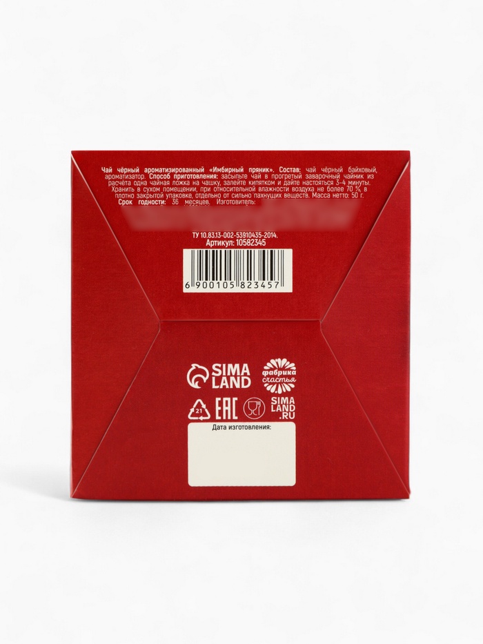 Габариты: 11,5 x 8 x 7 Доставка: Платная Страна: Россия В боксе: 125 шт Состав: См. на упаковке Материалы: см. на упаковке Фасовка: по 1 шт Индивидуальная упаковка: Термоусадочная пленка Сертификат: ЕАС Набор: Нет Вес нетто, г: 50 Фасовка: Весовой Вид чая: Чёрный Символ года: Нет Тематика праздника: Новый год Вкус: Имбирный пряник Подарочный чай: Да Добавки чая: Ароматизатор Вид упаковки: В картонной коробке При оформление заказа, просим запрашивать актуальные сроки годности у менеджераСостав: чай чёрный байховый, ароматизатор.. Способ приготовления: засыпьте чай в прогретый заварочный чайник из расчёта одна чайная ложка на чашку, залейте кипятком и дайте настояться 3–4 минуты. Хранить в сухом помещении, при относительной влажности воздуха не более 70 %, в плотно закрытой упаковке, отдельно от сильно пахнущих веществ. Срок годности: 36 месяцев. Масса нетто: 50 г. Комментарии к товару