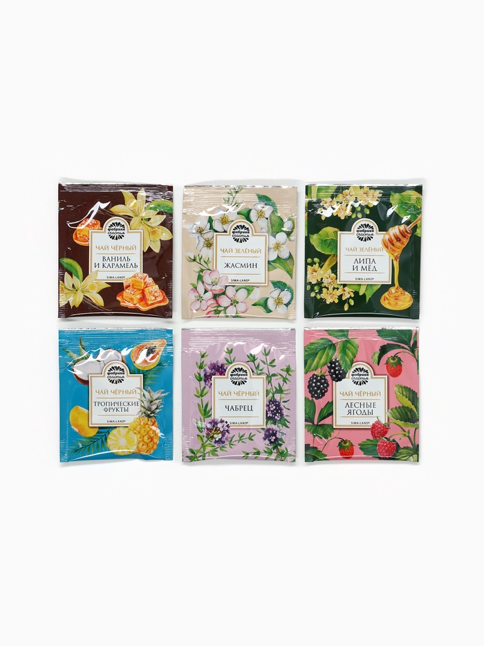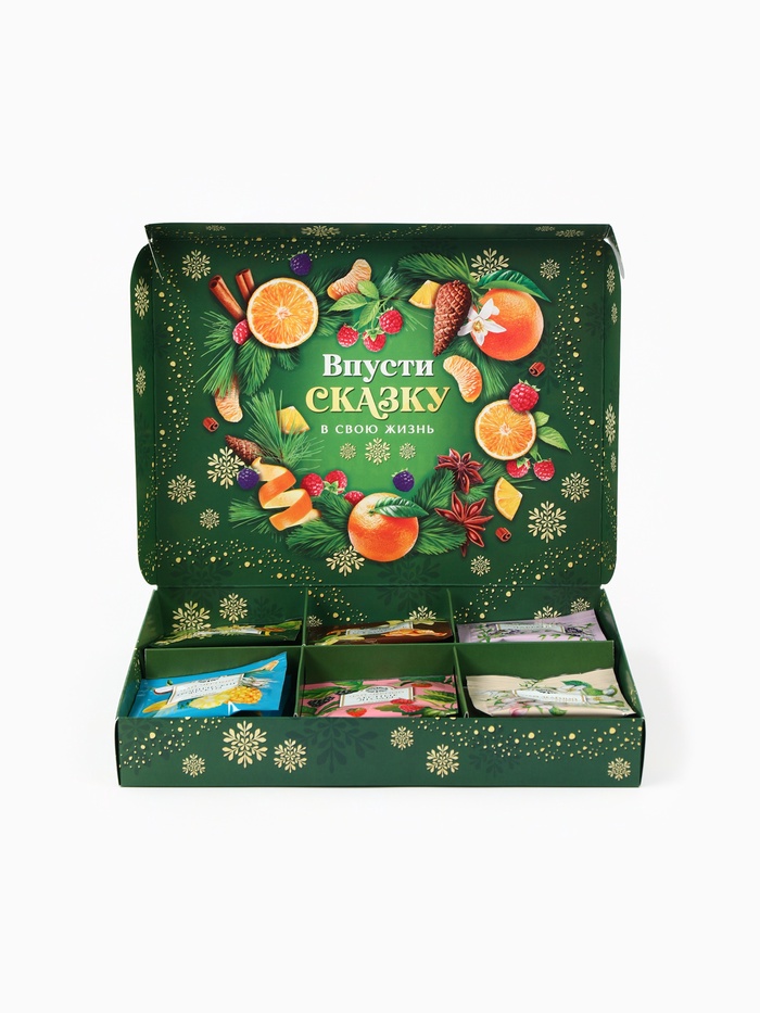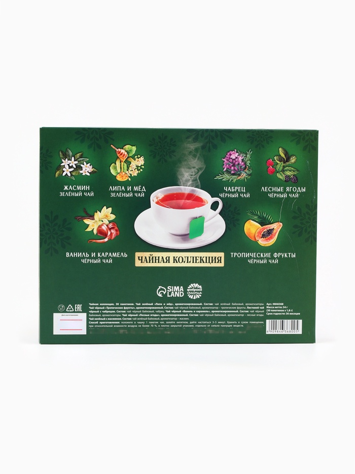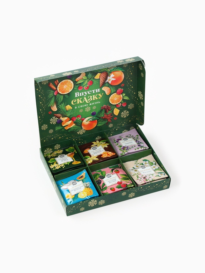 Габариты: 21,5 x 16,5 x 3 Страна: Россия В боксе: 75 набор Состав: См. на упаковке Материалы: см. на упаковке Фасовка: по 1 набор Индивидуальная упаковка: Термоусадочная пленка Сертификат: ЕАС Набор: Да Вес нетто, г: 54 Фасовка: Пакетированный Вид чая: Зелёный, Чёрный Символ года: Нет Тематика праздника: Новый год Подарочный чай: Нет Добавки чая: Ассорти Вид: В индивидуальных конвертах ПРИ ОФОРМЛЕНИИ ЗАКАЗА, ПРОСИМ ЗАПРАШИВАТЬ АКТУАЛЬНЫЕ СРОКИ ГОДНОСТИ У МЕНЕДЖЕРАЧай чёрный «Ваниль и карамель», ароматизированный.Состав: чай чёрный байховый, ароматизаторы пищевые.Чай чёрный «Лесные ягоды», ароматизированныйСостав: чай чёрный байховый, ароматизаторы пищевые.Чай зелёный «Липа и мёд».Состав: чай зелёный байховый, ароматизаторы пищевые.Чай чёрный с чабрецом.Состав: чай чёрный байховый, чабрец.Чай чёрный «Тропические фрукты».Состав: чай чёрный байховый, ароматизаторы пищевые.Чай зелёный с жасминомСостав: чай зелёный байховый с лепестками жасмина.Способ приготовления: 1 чайный пакетик на 250 мл залить горячей водой, настаивать 3–5 минут.Срок годности: 36 месяцев.Масса нетто: 54 г (30 пакетиков х 1,8 г). Комментарии к товару