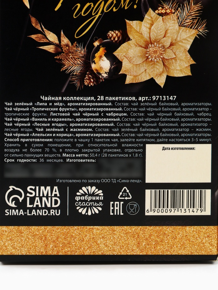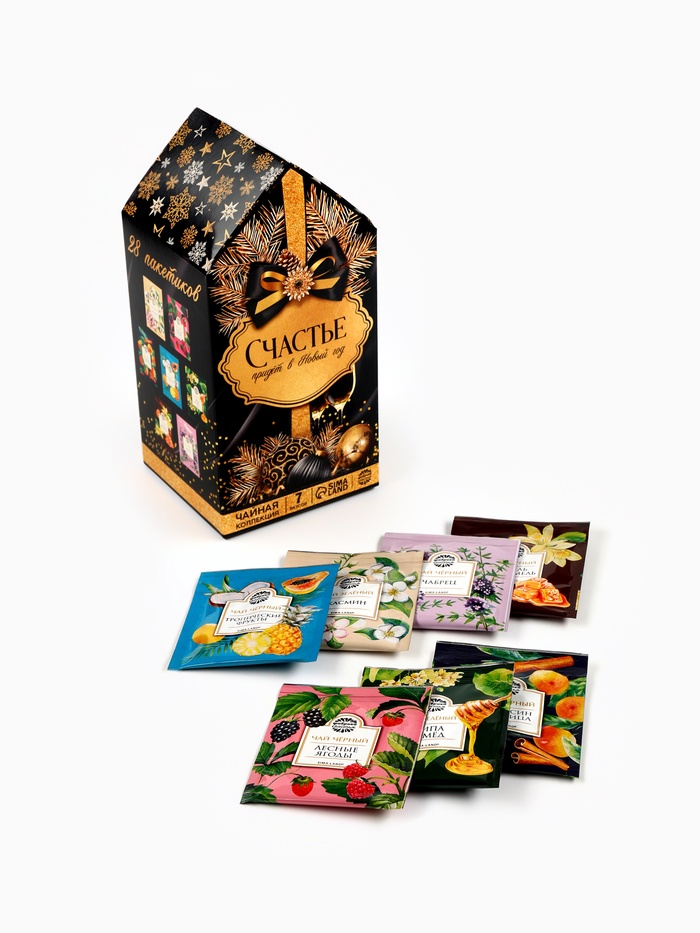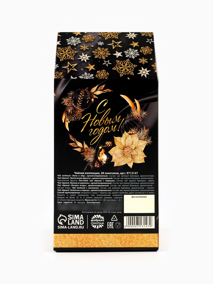 Габариты: 18 x 9 x 8,5 Страна: Россия В боксе: 50 шт Состав: См. на упаковке Материалы: см. на упаковке Фасовка: по 1 шт Индивидуальная упаковка: Термоусадочная пленка Сертификат: ЕАС Набор: Да Для кого: Унисекс В наборе, шт.: 1 Вес нетто, г: 50,4 Фасовка: Пакетированный Вид чая: Зелёный, Чёрный Вид упаковки: Подарочная коробка Символ года: Нет Тематика праздника: Новый год Адресат: Без адресата Подарочный чай: Да Составляющие набора: Чай Возраст: Для взрослых Добавки чая: Ассорти Вид: В индивидуальных конвертах ПРИ ОФОРМЛЕНИИ ЗАКАЗА, ПРОСИМ ЗАПРАШИВАТЬ АКТУАЛЬНЫЕ СРОКИ ГОДНОСТИ У МЕНЕДЖЕРА Чай чёрный «Апельсин и корица», ароматизированный Состав: чай чёрный байховый, ароматизаторы пищевые. Чай зелёный «Липа и мёд» Состав: чай зелёный байховый, ароматизаторы пищевые. Чай чёрный с тропическими фруктами. Состав: чай чёрный байховый, ароматизатор: тропические фрукты. Чай чёрный с лесными ягодами. Состав: чай чёрный байховый, ароматизатор: лесные ягоды. Чай чёрный с чабрецом Состав: Чай чёрный байховый, чабрец. Чай зелёный с жасмином Состав: чай зелёный байховый с лепестками жасмина. Чай чёрный, вкус: ваниль и карамель Состав: чай чёрный байховый, ароматизаторы пищевые. Способ приготовления: 1 чайный пакетик на 250 мл залить горячей водой, настаивать 3–5 минут. Срок годности: 36 месяцев. Масса нетто: 50, 4 г (28 пакетиков х 1,8 г). Комментарии к товару