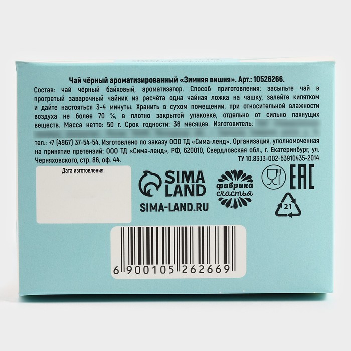 Габариты: 10,5 x 10,5 x 8,5 Страна: Россия В боксе: 100 шт Состав: См. на упаковке Материалы: см. на упаковке Фасовка: по 1 шт Индивидуальная упаковка: Термоусадочная пленка Сертификат: ЕАС Набор: Нет Вес нетто, г: 50 Фасовка: Весовой Вид чая: Чёрный Символ года: Нет Тематика праздника: Новый год Вкус: Вишня Подарочный чай: Да Добавки чая: Ароматизатор Вид упаковки: В картонной коробке При оформление заказа, просим запрашивать актуальные сроки годности у менеджераСостав: чай чёрный байховый, ароматизатор. Способ приготовления: засыпьте чай в прогретый заварочный чайник из расчёта одна чайная ложка на чашку, залейте кипятком и дайте настояться 3–4 минуты. Хранить в сухом помещении, при относительной влажности воздуха не более 70 %, в плотно закрытой упаковке, отдельно от сильно пахнущих веществ. Масса нетто: 50 г. Срок годности: 36 месяцев. Комментарии к товару