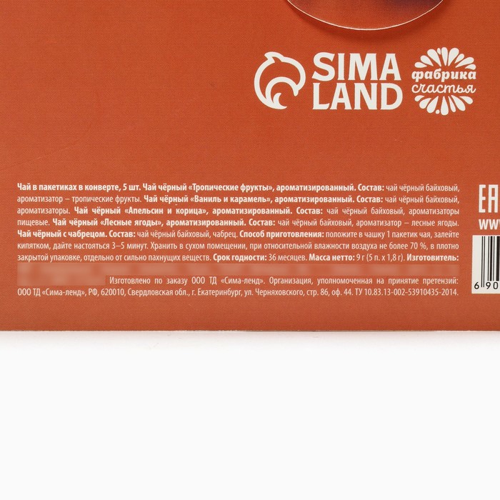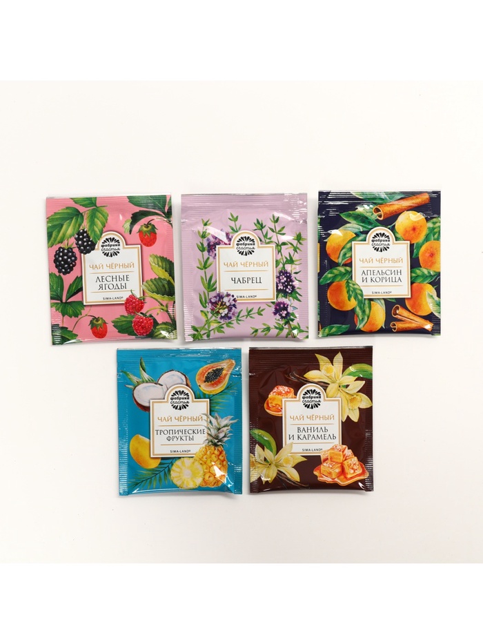 Габариты: 17 x 11 x 0,5 Страна: Россия В боксе: 70 шт Состав: См. на упаковке Материалы: см. на упаковке Фасовка: по 1 шт Индивидуальная упаковка: Термоусадочная пленка Сертификат: ЕАС Набор: Да Вес нетто, г: 9 Фасовка: Пакетированный Вид чая: Чёрный Символ года: Нет Тематика праздника: Новый год Подарочный чай: Да Добавки чая: Ассорти Вид: В индивидуальных конвертах ПРИ ОФОРМЛЕНИИ ЗАКАЗА, ПРОСИМ ЗАПРАШИВАТЬ АКТУАЛЬНЫЕ СРОКИ ГОДНОСТИ У МЕНЕДЖЕРА Чай чёрный «Тропические фрукты», ароматизированный.Состав: чай чёрный байховый, ароматизатор – тропические фрукты. Чай чёрный «Ваниль и карамель», ароматизированный.Состав: чай чёрный байховый, ароматизаторы. Чай чёрный «Апельсин и корица», ароматизированный.Состав: чай чёрный байховый, ароматизаторы пищевые. Чай чёрный «Лесные ягоды», ароматизированный.Состав: чай чёрный байховый, ароматизатор – лесные ягоды. Чай чёрный с чабрецом.Состав: чай чёрный байховый, чабрец. Срок годности: 36 месяцев Масса нетто: 9 г (5 п. х 1,8 г) Комментарии к товару