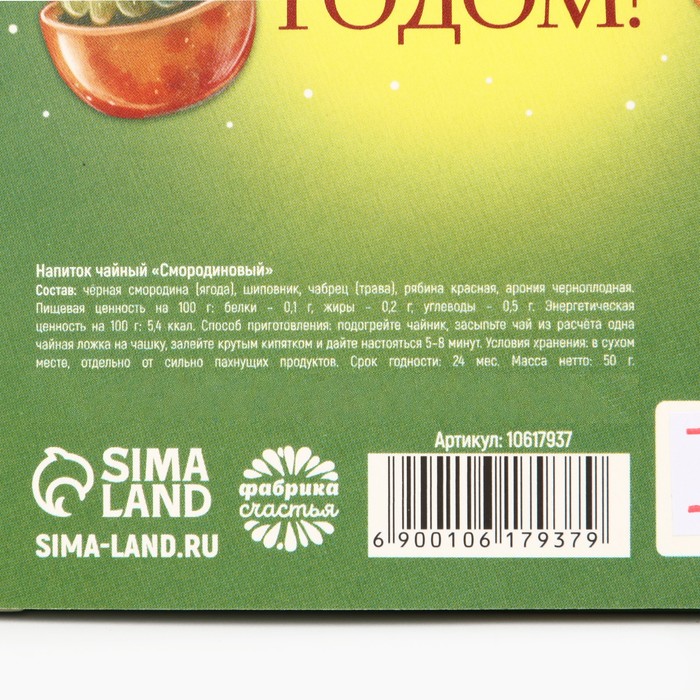 Габариты: 3,5 x 11 x 9,2 Страна: Россия В боксе: 250 шт Состав: См. на упаковке Материалы: см. на упаковке Фасовка: по 1 шт Индивидуальная упаковка: Термоусадочная пленка Сертификат: ЕАС Набор: Нет Вес нетто, г: 50 Фасовка: Весовой Вид чая: Травяной Символ года: Нет Тематика праздника: Новый год Вкус: Травы Подарочный чай: Да Добавки чая: Ассорти, Смородина Вид упаковки: В картонной коробке Фиксированная цена: Да ПРИ ОФОРМЛЕНИИ ЗАКАЗА, ПРОСИМ ЗАПРАШИВАТЬ АКТУАЛЬНЫЕ СРОКИ ГОДНОСТИ У МЕНЕДЖЕРА Состав: чёрная смородина (ягода), шиповник, чабрец (трава), рябина красная, арония черноплодная. Масса нетто: 50 г. Срок годности: 24 месяца. Комментарии к товару