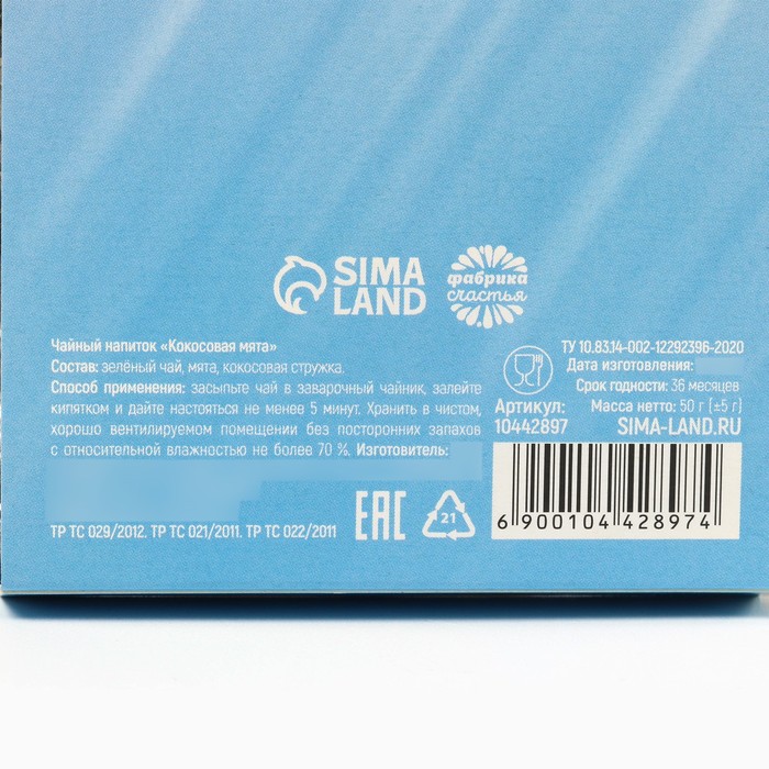 Габариты: 8 x 17 x 2 Страна: Россия В боксе: 240 шт Состав: См. на упаковке Материалы: см. на упаковке Фасовка: по 1 шт Индивидуальная упаковка: Термоусадочная пленка Сертификат: ЕАС Набор: Нет Вес нетто, г: 50 Фасовка: Весовой Вид чая: Зелёный Символ года: Нет Тематика праздника: Новый год Вкус: Мята, Кокос Подарочный чай: Да Добавки чая: Ароматизатор Вид упаковки: В картонной коробке Фиксированная цена: Да ПРИ ОФОРМЛЕНИИ ЗАКАЗА, ПРОСИМ ЗАПРАШИВАТЬ АКТУАЛЬНЫЕ СРОКИ ГОДНОСТИ У МЕНЕДЖЕРА Состав: чай зелёный, мята, кокосовая стружка. Способ приготовления: засыпьте чай в прогретый заварочный чайник из расчёта одна чайная ложка на чашку, залейте кипятком и дайте настояться 3–4 минуты. Хранить в сухом помещении, при относительной влажности воздуха не более 70 %, в плотно закрытой упаковке, отдельно от сильно пахнущих веществ. Масса нетто: 50 г. Срок годности: 36 месяцев. Комментарии к товару