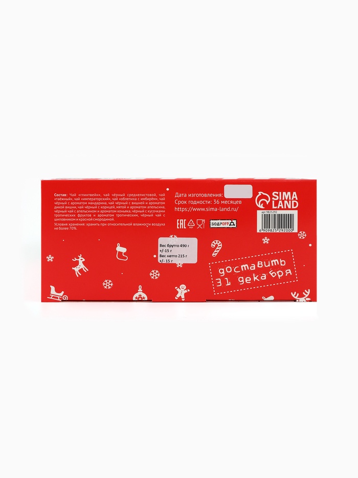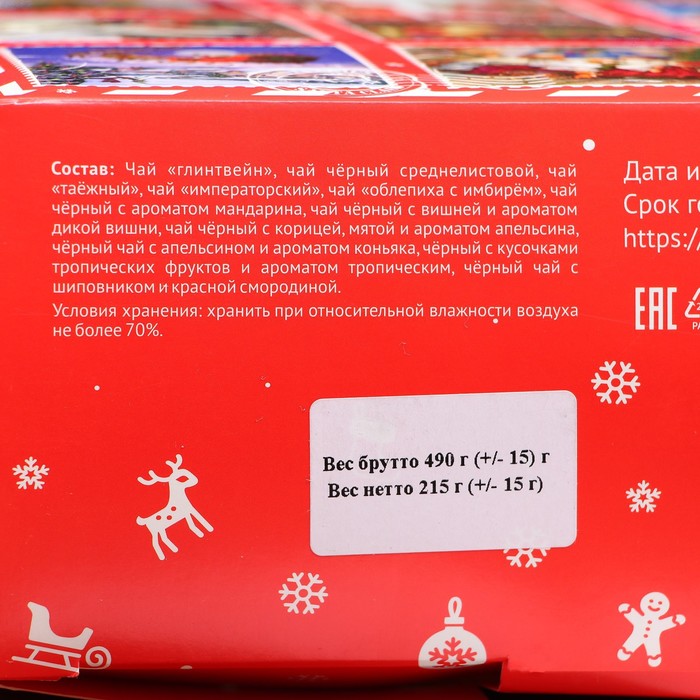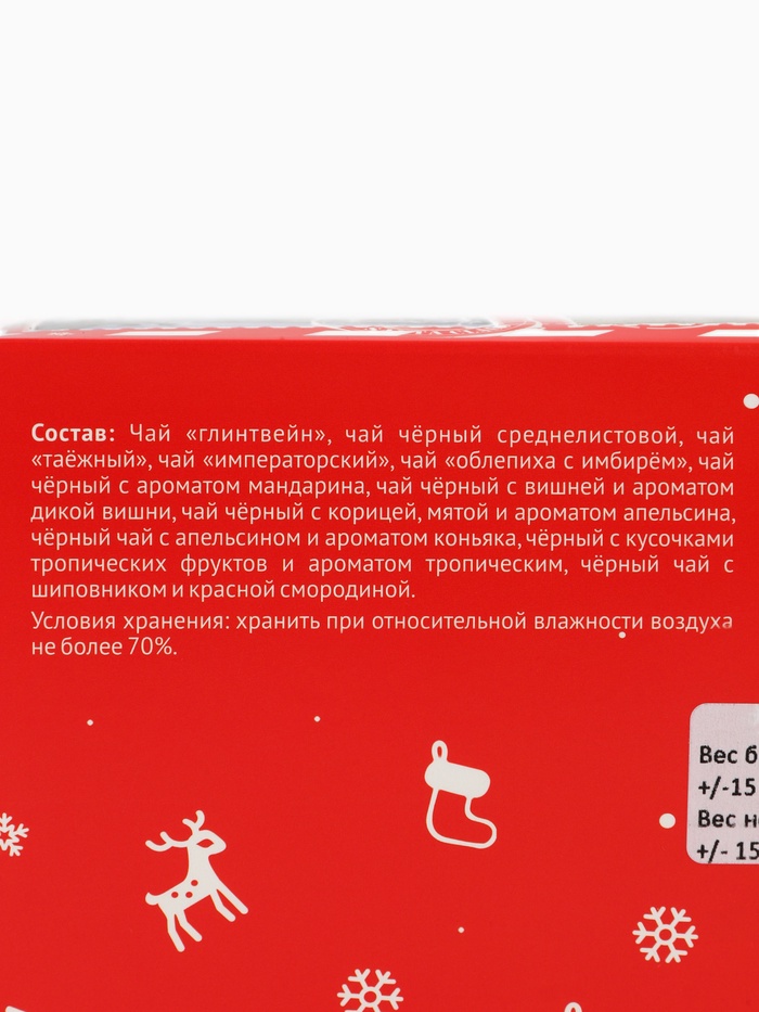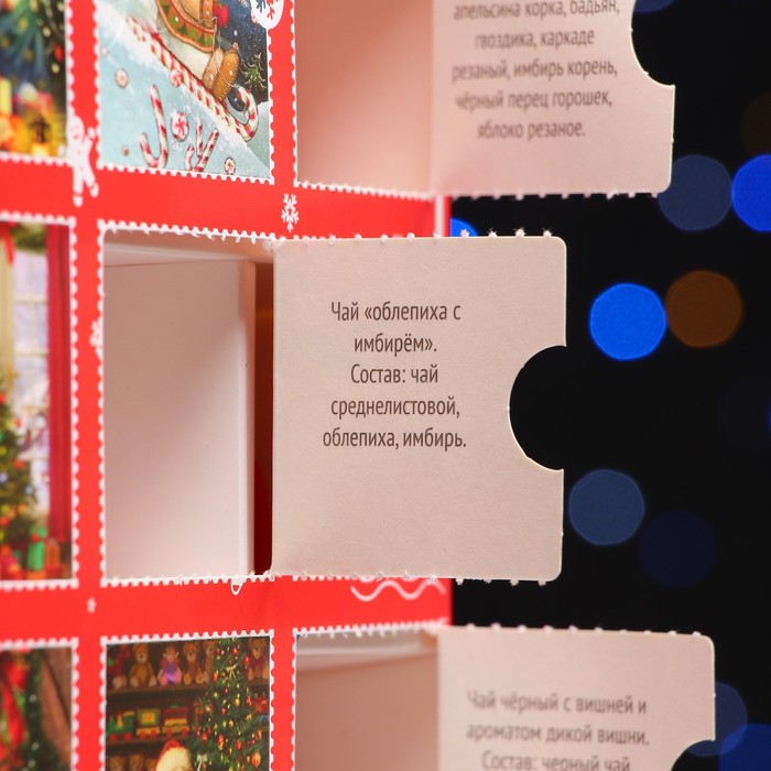 Габариты: 27,5 x 21 x 9 Страна: Россия В боксе: 16 шт Состав: См. на упаковке Материалы: см. на упаковке Фасовка: по 1 шт Индивидуальная упаковка: Термоусадочная пленка Сертификат: ЕАС Набор: Да Для кого: Унисекс Возраст: От 1 года В наборе, шт.: 12 Количество дней: 12 Вес нетто, г: 215 Фасовка: Весовой Вид чая: Ассорти Тематика: Новогодняя Вид упаковки: Картонная упаковка Символ года: Нет Тематика праздника: Новый год Адресат: Без адресата Материал: Картон Вкус: Ассорти Подарочный чай: Да Составляющие набора: Чай Возраст: Для взрослых Добавки чая: Облепиха, Имбирь, Ассорти, Апельсин, Глинтвейн, Вишня, Шиповник, Мята "Чайный адвент-календарь ""Новогодний очаг"" - это идеальный подарок на новогодние праздники. С помощью такого необычного календаря можно радовать себя 12 разными вкусами чая. Разместите сувенир на видном месте, например, на кухне или в гостиной, и каждый день вскрывайте по одной ячейке и наслаждайтесь потрясающим вкусом чая. ![]() В состав адвент-календаря входят: