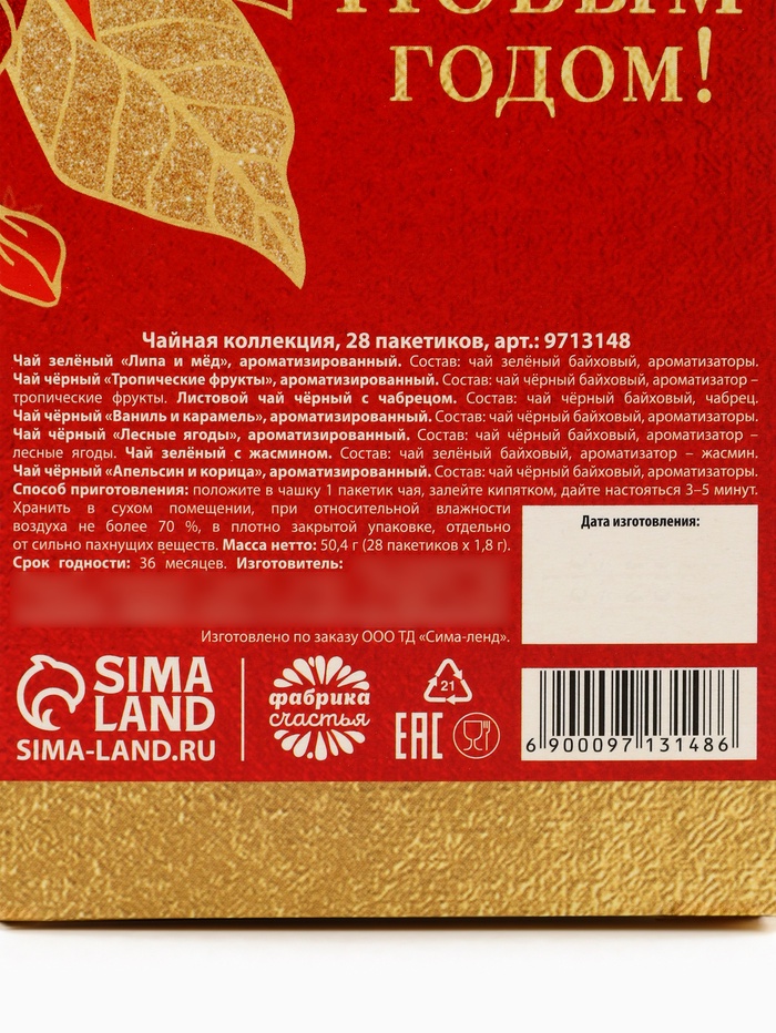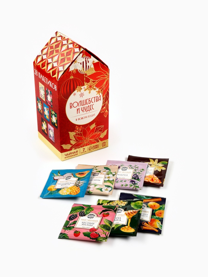 Габариты: 18 x 9 x 8,5 Страна: Россия В боксе: 50 шт Состав: См. на упаковке Материалы: см. на упаковке Фасовка: по 1 шт Индивидуальная упаковка: Термоусадочная пленка Сертификат: ЕАС Набор: Да Для кого: Унисекс В наборе, шт.: 1 Вес нетто, г: 50,4 Фасовка: Пакетированный Вид чая: Чёрный, Зелёный Вид упаковки: Подарочная коробка Символ года: Нет Тематика праздника: Новый год Адресат: Без адресата Подарочный чай: Да Составляющие набора: Чай Возраст: Для взрослых Добавки чая: Ассорти Вид: В индивидуальных конвертах При оформление заказа, просим запрашивать актуальные сроки годности у менеджераЧай чёрный «Апельсин и корица», ароматизированный Состав: чай чёрный байховый, ароматизаторы пищевые. Чай зелёный «Липа и мёд» Состав: чай зелёный байховый, ароматизаторы пищевые. Чай чёрный с тропическими фруктами. Состав: чай чёрный байховый, ароматизатор: тропические фрукты. Чай чёрный с лесными ягодами. Состав: чай чёрный байховый, ароматизатор: лесные ягоды. Чай чёрный с чабрецом Состав: Чай чёрный байховый, чабрец. Чай зелёный с жасмином Состав: чай зелёный байховый с лепестками жасмина. Чай чёрный, вкус: ваниль и карамель Состав: чай чёрный байховый, ароматизаторы пищевые. Способ приготовления: 1 чайный пакетик на 250 мл залить горячей водой, настаивать 3–5 минут. Срок годности: 36 месяцев. Масса нетто: 50, 4 г (28 пакетиков х 1,8 г). Комментарии к товару