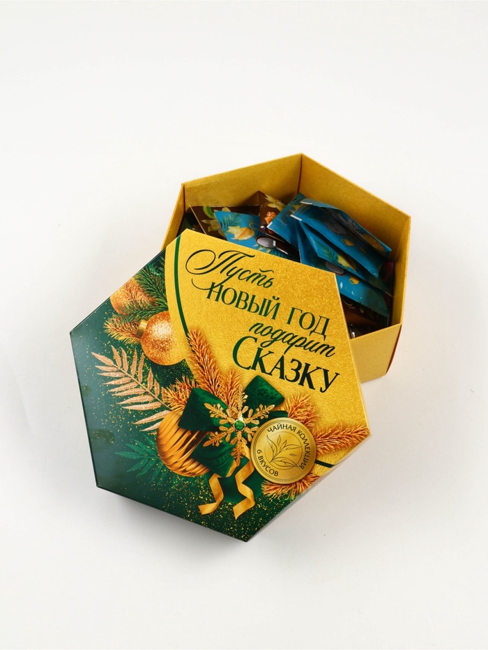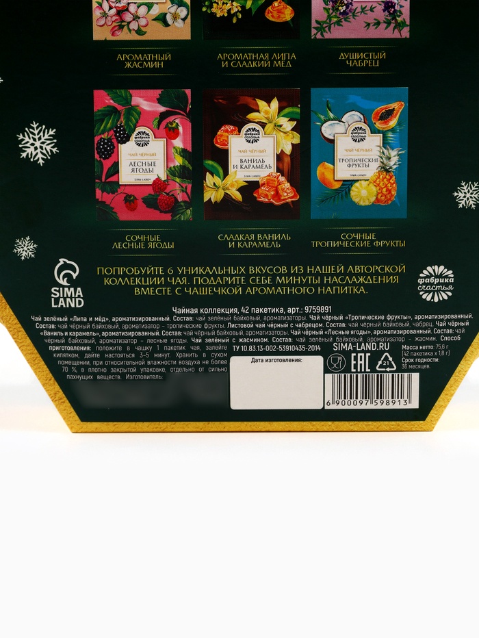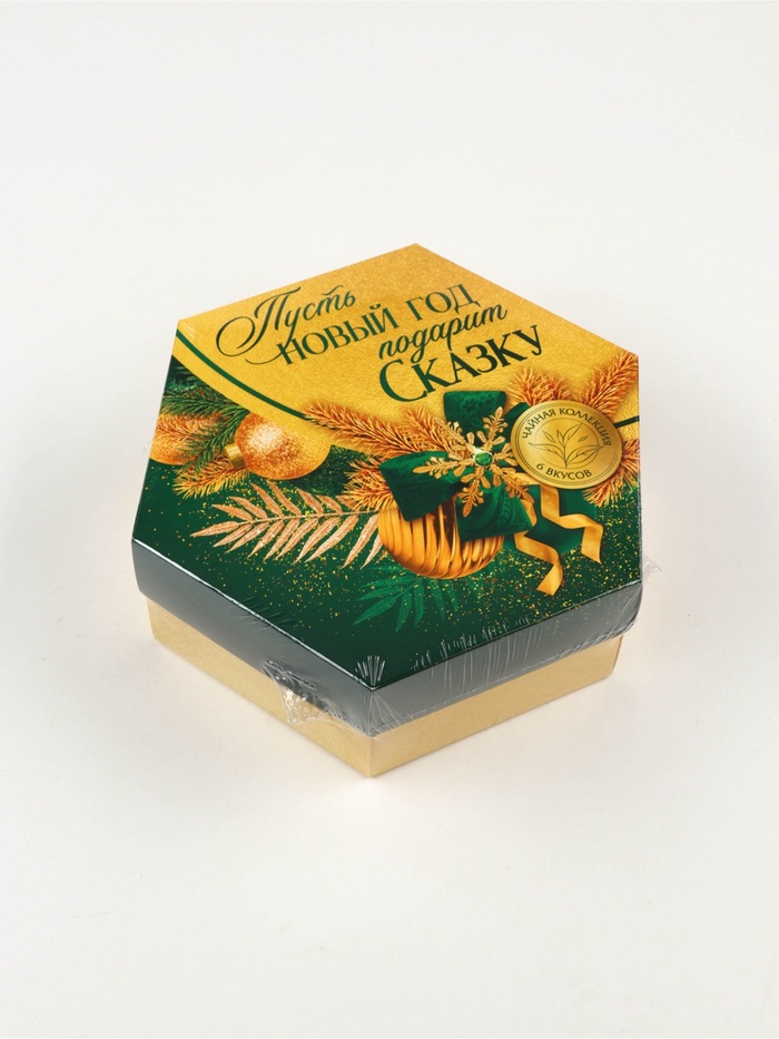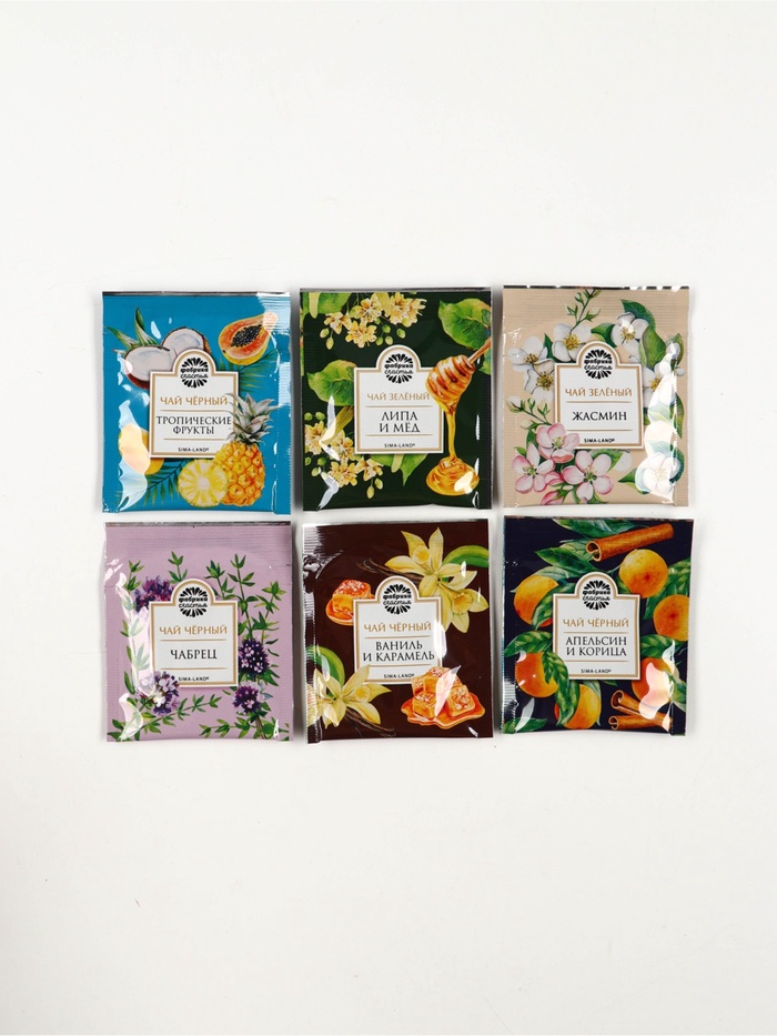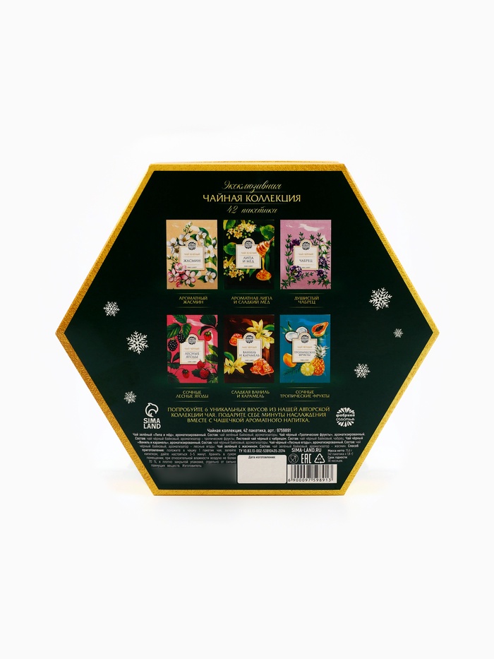 Габариты: 19,8 x 17,3 x 6,8 Страна: Россия В боксе: 36 набор Состав: См. на упаковке Материалы: см. на упаковке Фасовка: по 1 набор Индивидуальная упаковка: Термоусадочная пленка Сертификат: ЕАС Набор: Да Вес нетто, г: 75,6 Фасовка: Пакетированный Вид чая: Зелёный, Чёрный Вид упаковки: Подарочная коробка Символ года: Нет Тематика праздника: Новый год Подарочный чай: Да Добавки чая: Ассорти ПРИ ОФОРМЛЕНИИ ЗАКАЗА, ПРОСИМ ЗАПРАШИВАТЬ АКТУАЛЬНЫЕ СРОКИ ГОДНОСТИ У МЕНЕДЖЕРАЧай чёрный «Ваниль и карамель», ароматизированный.Состав: чай чёрный байховый, ароматизаторы пищевые.Чай чёрный «Апельсин и корица», ароматизированныйСостав: чай чёрный байховый, ароматизаторы пищевые.Чай зелёный «Липа и мёд».Состав: чай зелёный байховый, ароматизаторы пищевые.Чай чёрный с чабрецом.Состав: чай чёрный байховый, чабрец.Чай чёрный «Тропические фрукты».Состав: чай чёрный байховый, ароматизаторы пищевые.Чай зелёный с жасминомСостав: чай зелёный байховый с лепестками жасмина.Способ приготовления: 1 чайный пакетик на 250 мл залить горячей водой, настаивать 3–5 минут.Срок годности: 36 месяцев.Масса нетто: 54 г (30 пакетиков х 1,8 г). Комментарии к товару
