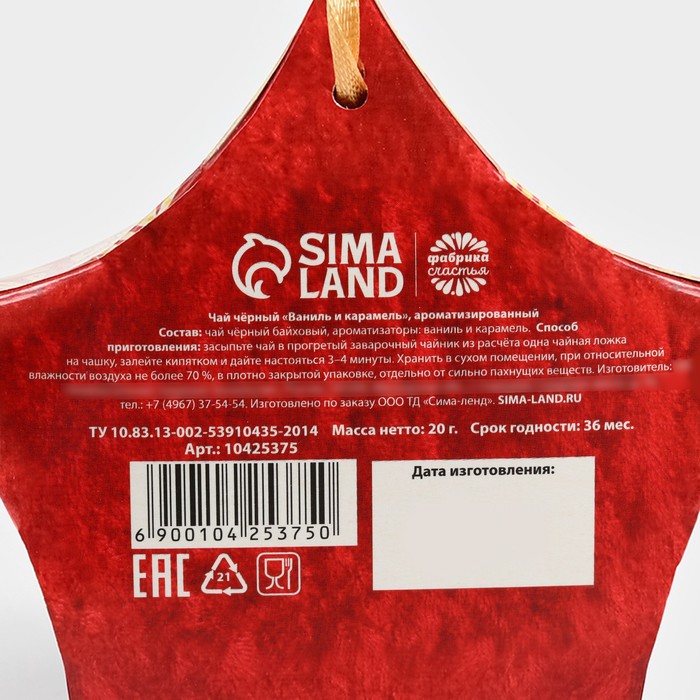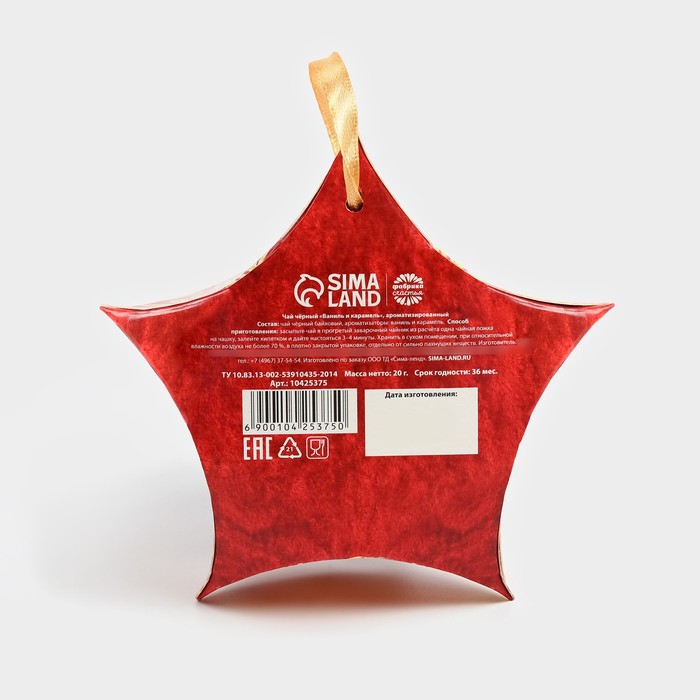 Габариты: 12 x 12 x 4 Страна: Россия В боксе: 220 шт Состав: См. на упаковке Материалы: см. на упаковке Фасовка: по 1 шт Индивидуальная упаковка: Термоусадочная пленка Сертификат: ЕАС Набор: Нет Вес нетто, г: 20 Фасовка: Весовой Вид чая: Чёрный Символ года: Нет Тематика праздника: Новый год Вкус: Карамель, Ваниль Подарочный чай: Да Добавки чая: Ароматизатор Вид упаковки: В картонной коробке При оформление заказа, просим запрашивать актуальные сроки годности у менеджераСостав: чай чёрный байховый, ароматизаторы: ваниль и карамель. Способ приготовления: засыпьте чай в прогретый заварочный чайник из расчёта одна чайная ложка на чашку, залейте кипятком и дайте настояться 3–4 минуты. Хранить в сухом помещении, при относительной влажности воздуха не более 70 %, в плотно закрытой упаковке, отдельно от сильно пахнущих веществ. Масса нетто: 20 г Срок годности: 36 месяцев. Комментарии к товару