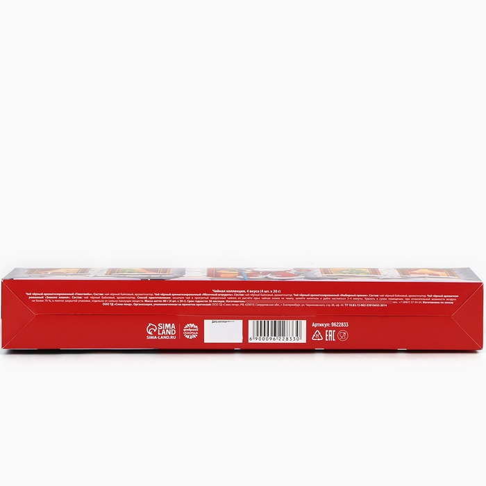Габариты: 31,7 x 13,7 x 4,5 Страна: Россия В боксе: 45 набор Состав: См. на упаковке Материалы: см. на упаковке Фасовка: по 1 набор Индивидуальная упаковка: Термоусадочная пленка Сертификат: ЕАС Набор: Нет Вес нетто, г: 80 Фасовка: Весовой Вид чая: Чёрный Символ года: Нет Тематика праздника: Новый год Вкус: Ассорти Подарочный чай: Да Добавки чая: Ароматизатор Вид упаковки: В картонной коробке ПРИ ОФОРМЛЕНИИ ЗАКАЗА, ПРОСИМ ЗАПРАШИВАТЬ АКТУАЛЬНЫЕ СРОКИ ГОДНОСТИ У МЕНЕДЖЕРА Чай чёрный "Глинтвейн" Состав: чай чёрный байховый, ароматизатор. Чай чёрный "Яблочный штрудель". Состав: чай чёрный байховый, ароматизатор. Чай чёрный "Имбирный пряник" Состав: чай чёрный байховый, ароматизатор. Чай чёрный "Зимняя вишня" Состав: чай чёрный байховый, ароматизатор. Способ приготовления: засыпьте чай в прогретый заварочный чайник из расчёта одна чайная ложка на чашку, залейте кипятком и дайте настояться 3-4 минуты. Срок годности: 36 месяцев Масса нетто: 50 г (4 шт. х 20 г). Комментарии к товару