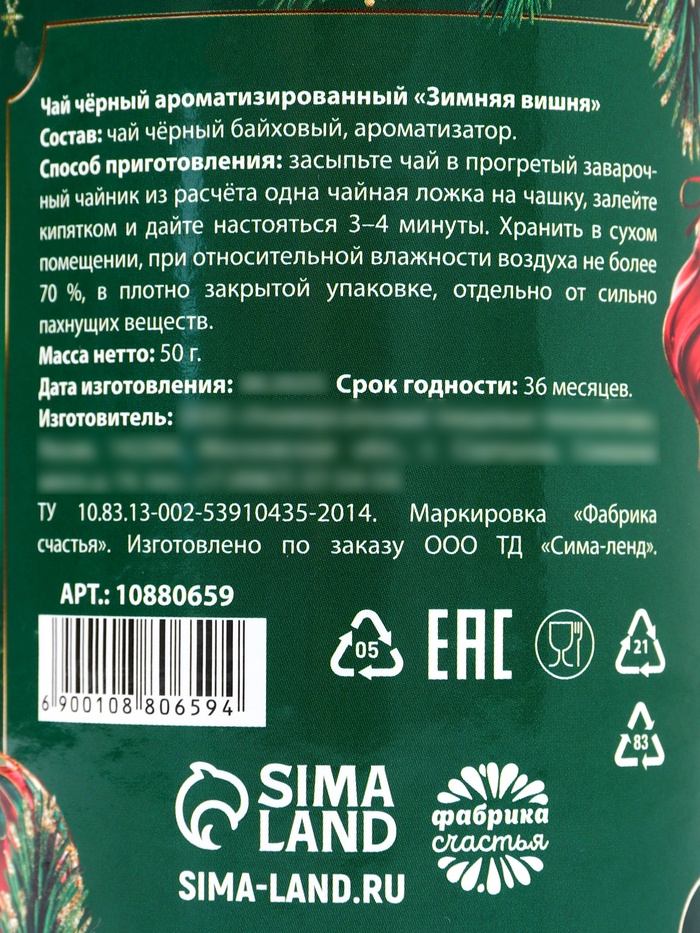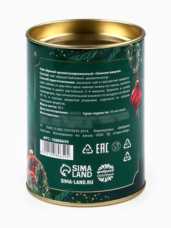 Габариты: 7,7 x 7,7 x 10,5 Страна: Россия Состав: См. на упаковке Материалы: см. на упаковке Фасовка: по 1 шт Индивидуальная упаковка: Без упаковки Сертификат: ЕАС Набор: Нет Вес нетто, г: 50 Фасовка: Весовой Вид чая: Чёрный Символ года: Нет Тематика праздника: Новый год Вкус: Вишня Подарочный чай: Да Добавки чая: Ароматизатор Вид упаковки: В банке ПРИ ОФОРМЛЕНИИ ЗАКАЗА, ПРОСИМ ЗАПРАШИВАТЬ АКТУАЛЬНЫЕ СРОКИ ГОДНОСТИ У МЕНЕДЖЕРА Чай чёрный ароматизированный "Зимняя вишня"Состав: чай чёрный байховый, ароматизатор. Срок годности: 36 месяцев Масса нетто: 50 г. Комментарии к товару
