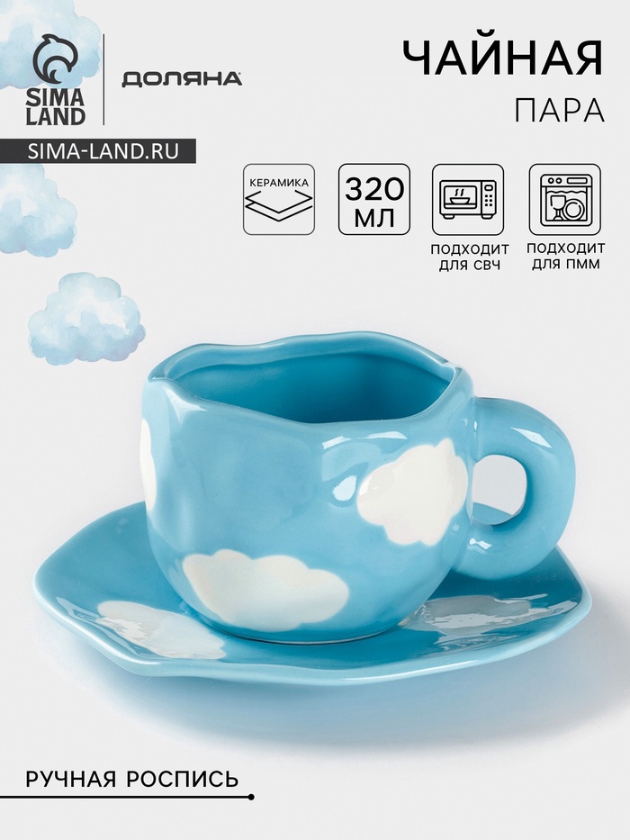 Погрузитесь в атмосферу лёгкости и свежести с этой очаровательной чайной парой, которая станет идеальным спутником для ваших уютных чаепитий. Каждая деталь, от чашки до блюдца, украшена ручной росписью в небесных тонах, что придаёт набору уникальность и стиль.