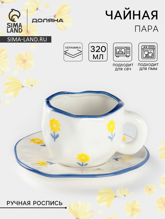 Габариты: 15,5 x 15,5 x 9,5 Страна: Китай В боксе: 48 пара Состав: Керамика Материалы: керамика Фасовка: по 1 пара Индивидуальная упаковка: Цветная картонная коробка Сертификат: СТР Набор: Да Цвет: Белый Количество персон: 1 В наборе, шт.: 2 Объём, мл: 320 Тематика: Цветочно-растительная Рисунок: Да Материал: Керамика Наличие подставки: Нет Можно мыть в посудомоечной машине: Да Можно использовать в СВЧ-печи: Да Текстура: Гладкая Особенности: Без особенностей Матовая поверхность: Нет Откройте для себя истинное наслаждение чаепитием с этой уютной чайной парой, которая привнесёт в ваши будни нотку изящества и природной красоты. Каждая деталь, от чашки до блюдца, выполнена вручную и украшена изысканным цветочным рисунком, воплощающим нежность одуванчиков, что делает этот набор уникальным и неповторимым. Объем чашки в 320 мл идеально подходит для уютного чаепития, а блюдце диаметром 16 см заботится о том, чтобы ваш стол выглядел аккуратно и стильно. Чистый белый цвет керамики создаёт впечатление свежести, а гладкая текстура придаёт дополнительное удовольствие при использовании. Преимущества: