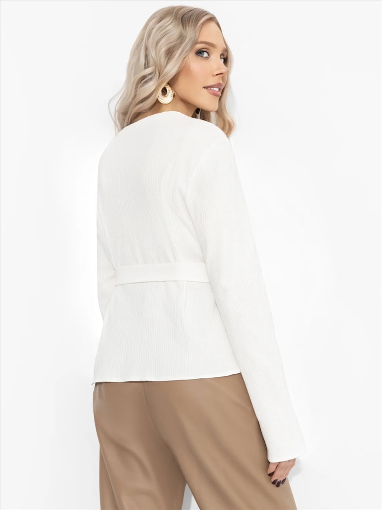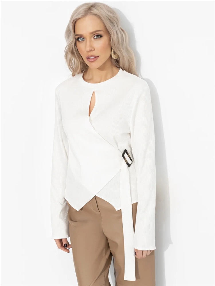 Джемпер в главном оттенке 2026 года по версии Pantone – Cloud Dancer – говорит о женственности без лишних слов. Воздушный белый транслирует окружающим твое абсолютное спокойствие и уверенность, а акцентный вырез добавляет провокации: дерзко, стильно, на ваших условиях. С брюками или юбкой легко получится образ, который покоряет с первого взгляда. Джемпер из хлопка: ткань плотная, гладкая, дышащая, эластичная, держит форму без деформаций. Полуприлегающий силуэт со спущенной линией плеча удлиняет шею. Асимметричный запах с поясом подчеркивает талию.