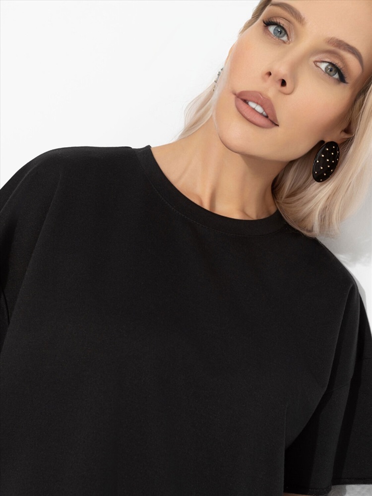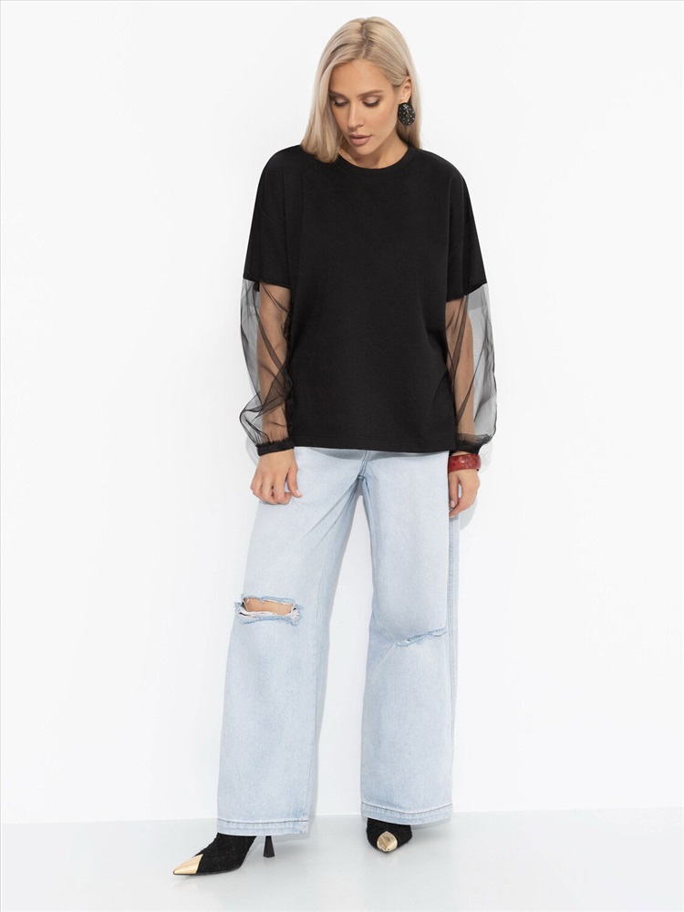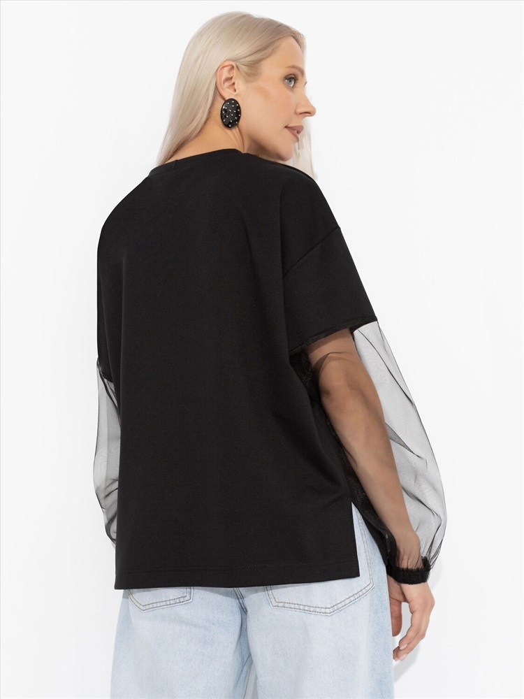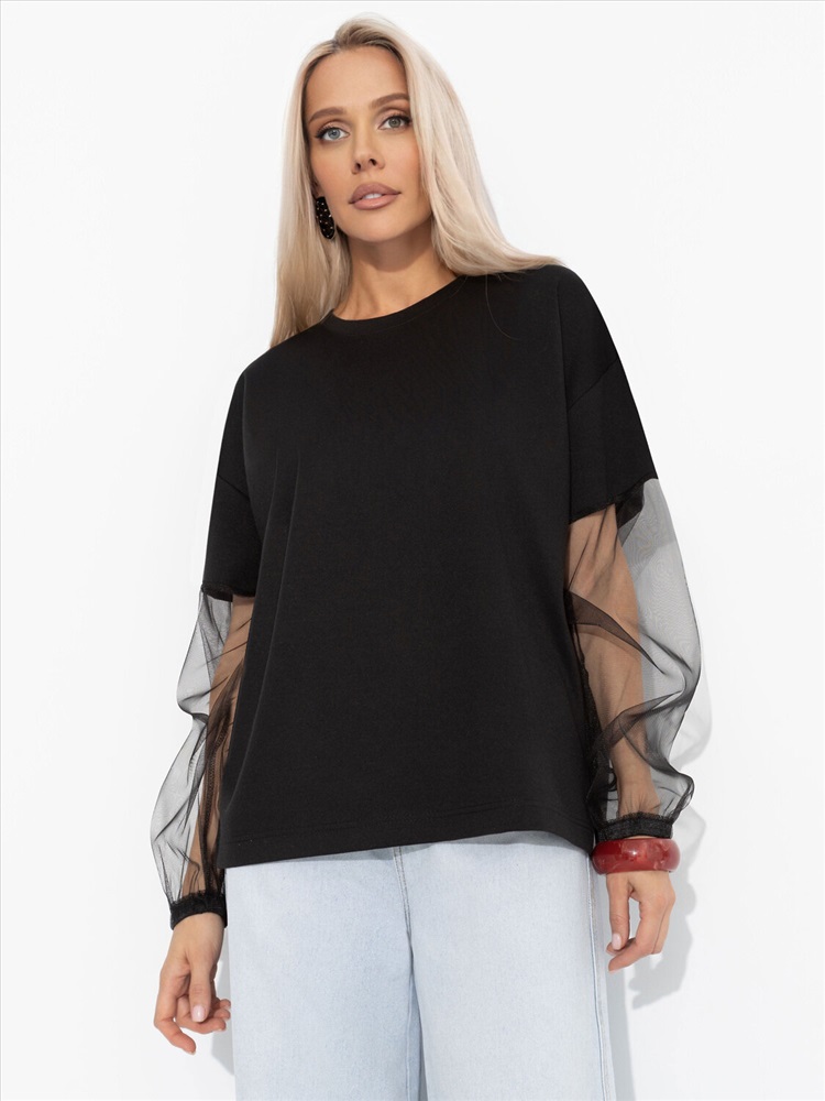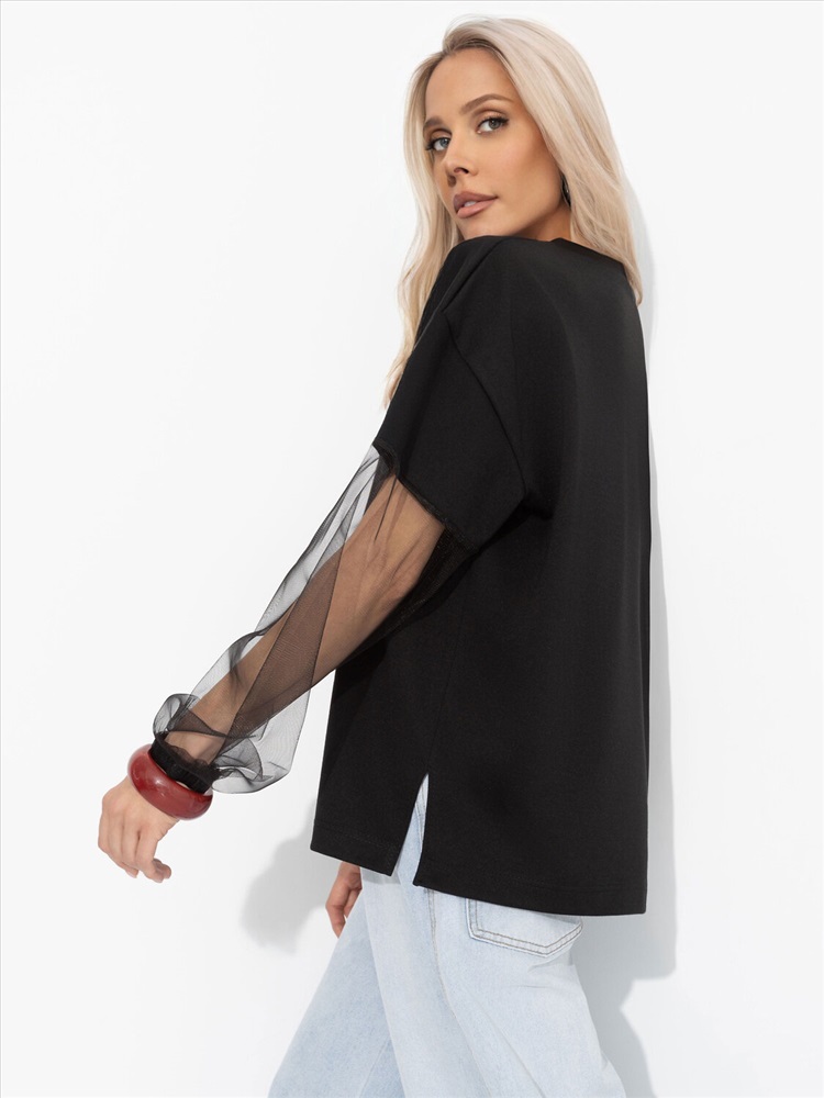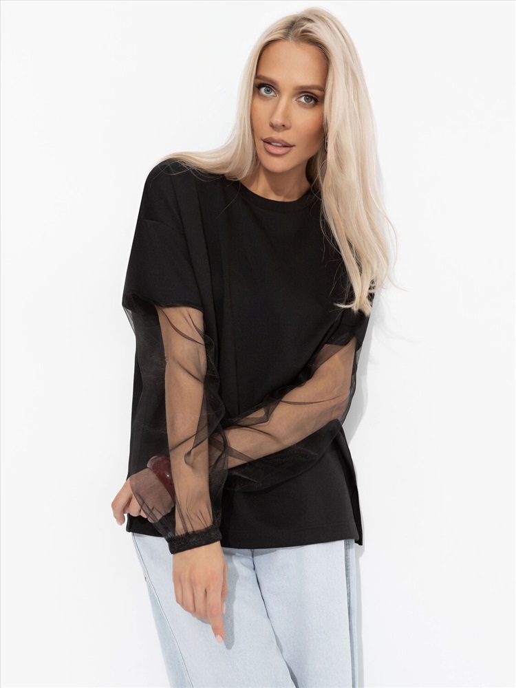 Заказывали мгновенное преображение из комфортного образа в стильный? Прозрачные рукава добавляют ноту смелой чувственности, не жертвуя при этом непринуждённой эстетикой. Футболка легко сочетается с кожаными брюками для вечеринки или с джинсами для повседневного шика. Футболка свободного кроя. Часть рукавов оформлена тонкой сеткой. Манжеты рукавов прошиты из основного материала. Линия плеча спущена. Деликатные разрезы по бокам изделия.