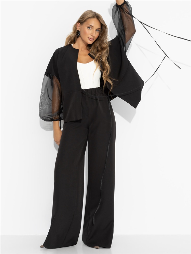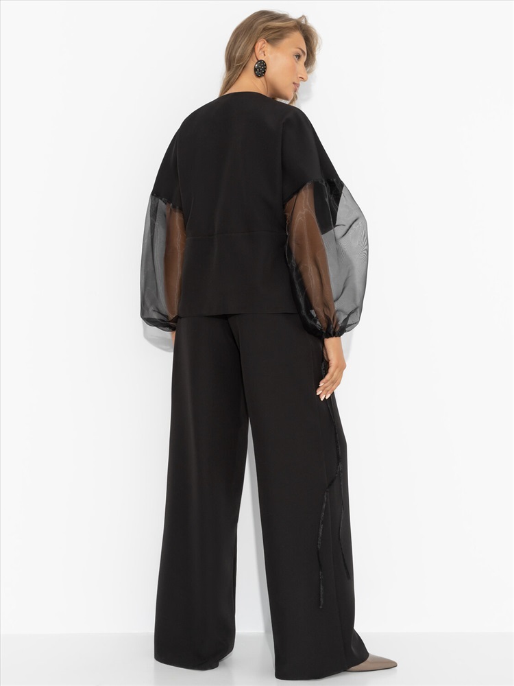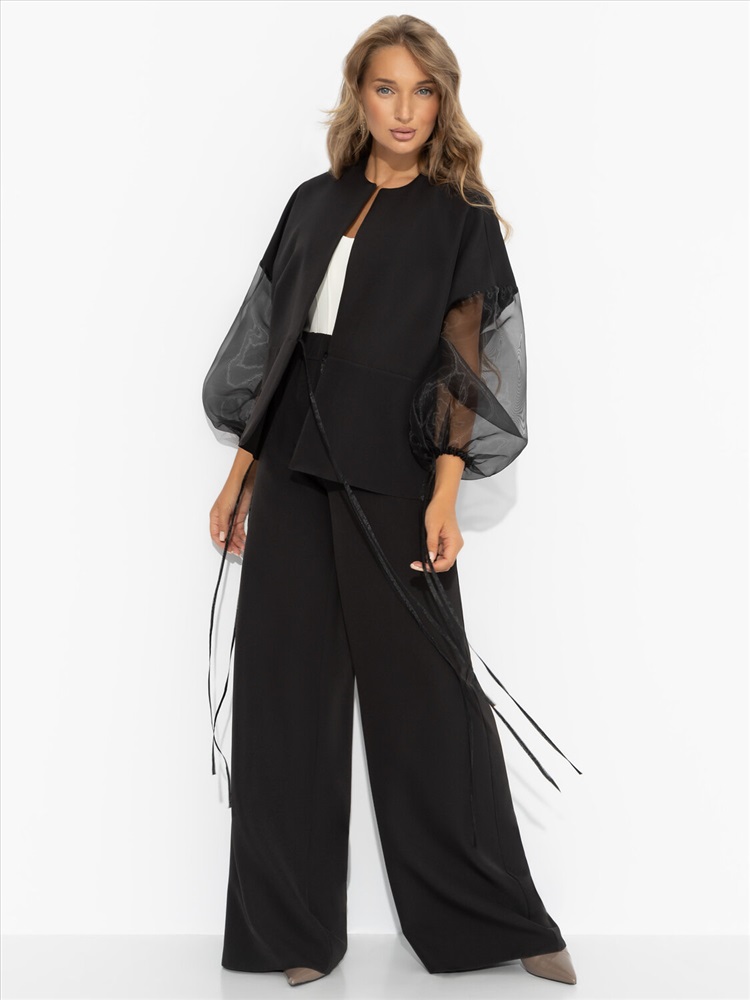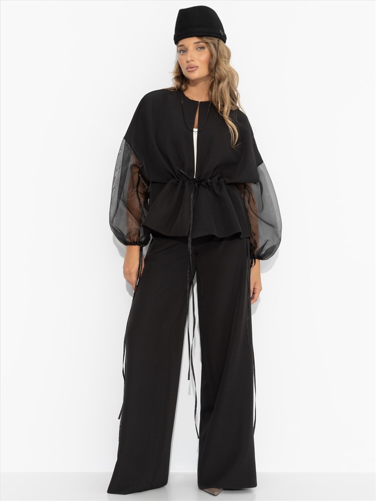 Костюм ЧАРУТТИ — идеальное воплощение её двойственной натуры: строгий силуэт говорит о профессионализме, а воздушная ткань — о лёгком и игривом характере. В нём она одинаково уверенно чувствует себя на важном совещании и за бокалом вина с подругами, где её смех звенит громче любых слов. Можно быть разной, оставаясь собой: собранной, но не скучной, элегантной, но с искоркой. Комплект состоит из широких брюк и жакета свободного кроя. Брюки с высокой посадкой, с карманами. Пояс брюк на широкой скрытой резинке. Рукава жакета из органзы в тон основного материала. Рукава также оформлены тонкими завязками. Жакет с тонкими завязками в виде кулиски.