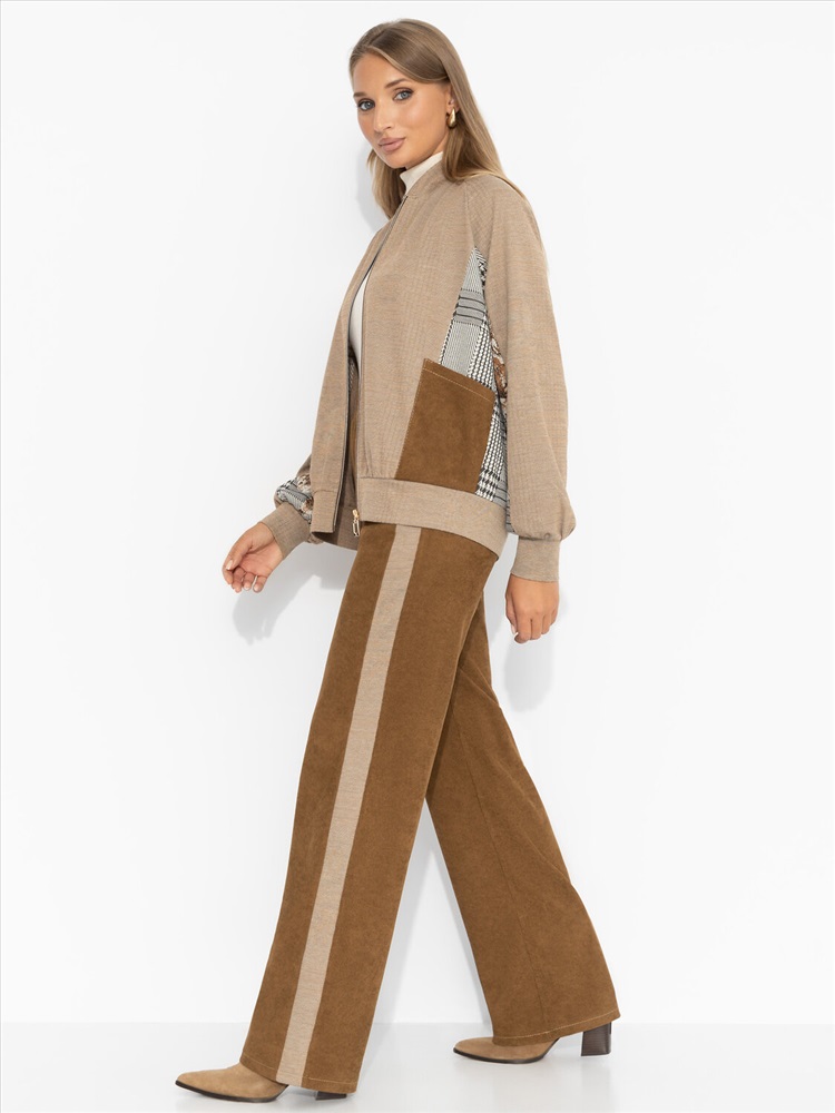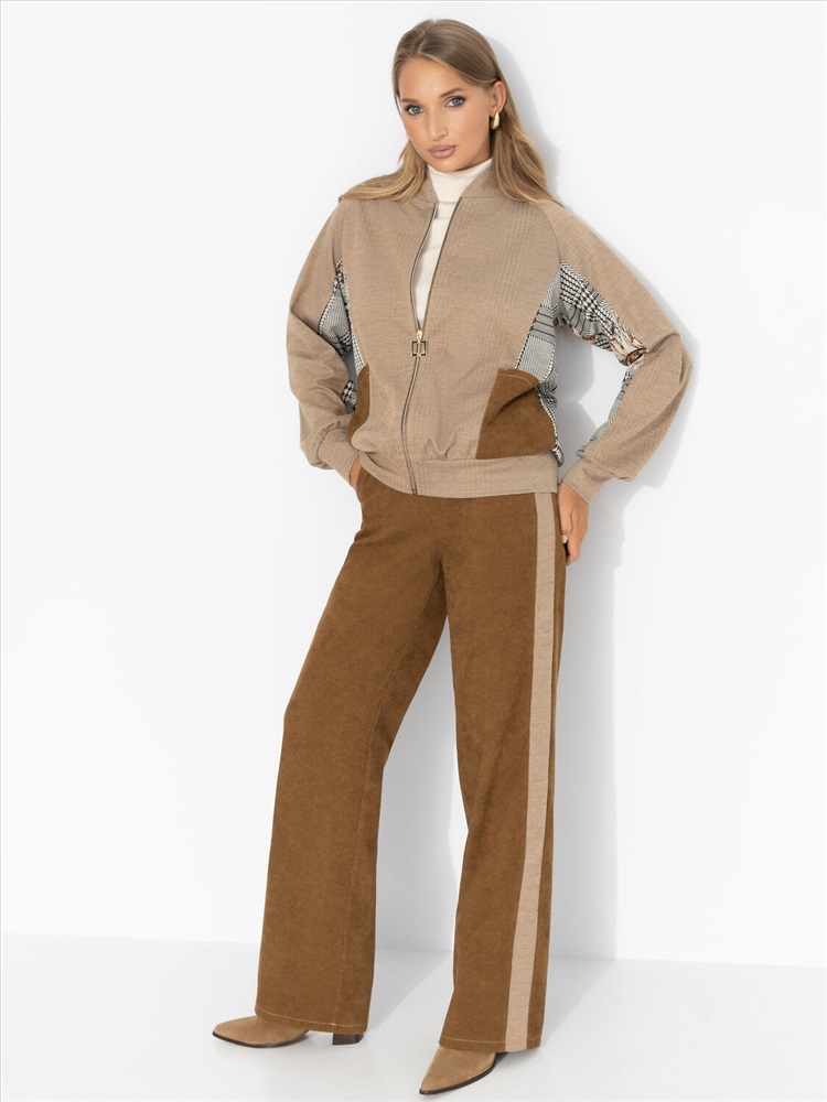 Производитель: CHARUTTI; Российский размер: 46; Обхват груди: 92; Обхват талии: 74; Обхват бедер: 98; Артикул поставщика: 12248; Ткань: Костюмная ткань «вельвет», трикотаж «жаккард» двухсторонний; Состав: 65% п/э, 30% вискоза, 5% спандекс; Год: 2025; Страна: Россия; Подклад: Нет; Карманы: Накладные; Сезон: Зима; Плотность ткани: Плотная; Застежка: Молния; Отрезная талия: Нет; Уход: Ручная стирка, Деликатный режим стирки при 30°C, Глажение при температурном режиме не более 110°C, Отбеливание запрещено; Силуэт: Свободный; Рост: 164-170 Костюм ЧАРУТТИ — ваш безупречный спутник для полета в бизнес-классе в солнечную Италию. Элегантные брюки из благородного вельвета и бомбер создают образ, который говорит о вашем статусе еще до посадки в самолет. Образ, в котором вы будете чувствовать себя комфортно во время долгого перелета и при этом безупречно выглядеть при выходе из аэропорта. Сойдите с трапа готовой к деловым встречам или прогулкам по римским улочкам. Комплект состоит из брюк прямого кроя и бомбера с карманами. Брюки с акцентными лампасами на резинке, есть карманы. Посадка высокая на талии.
