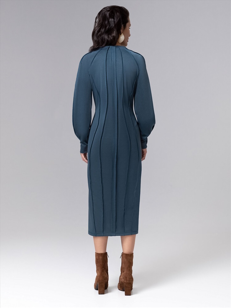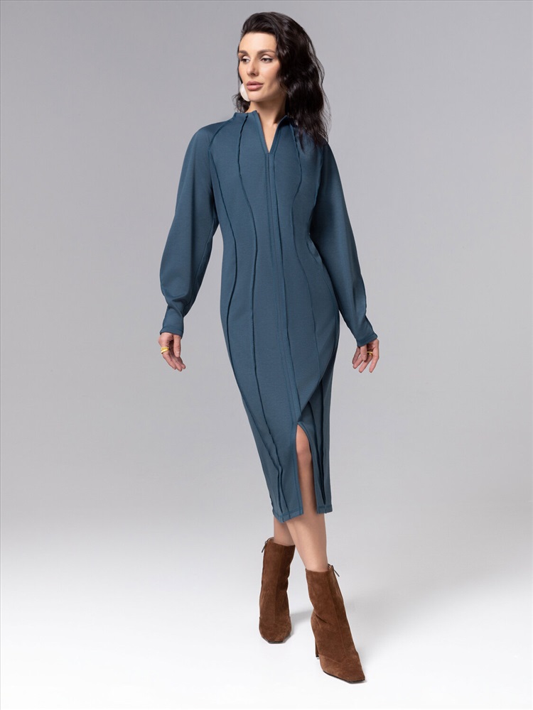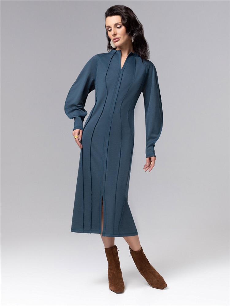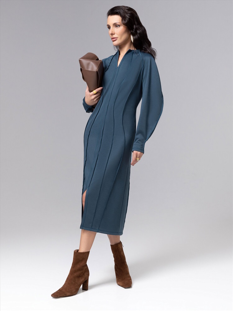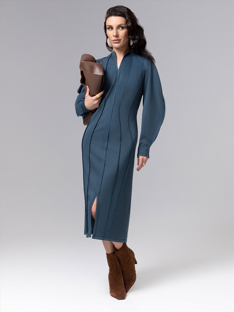 Платье ЧАРУТТИ полуприлегающего силуэта в глубоком оттенке цвета морской волны олицетворяет собой гармонию современной элегантности и виртуозного кроя. Выразительные внешние швы не только моделируют изящный силуэт, но и выступают в роли стильного декоративного элемента. Безупречный пошив проявляется в ювелирной точности лекал, безукоризненном соединении деталей и использовании передовых технологий, обеспечивающих комфорт и идеальную посадку.