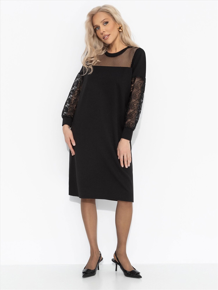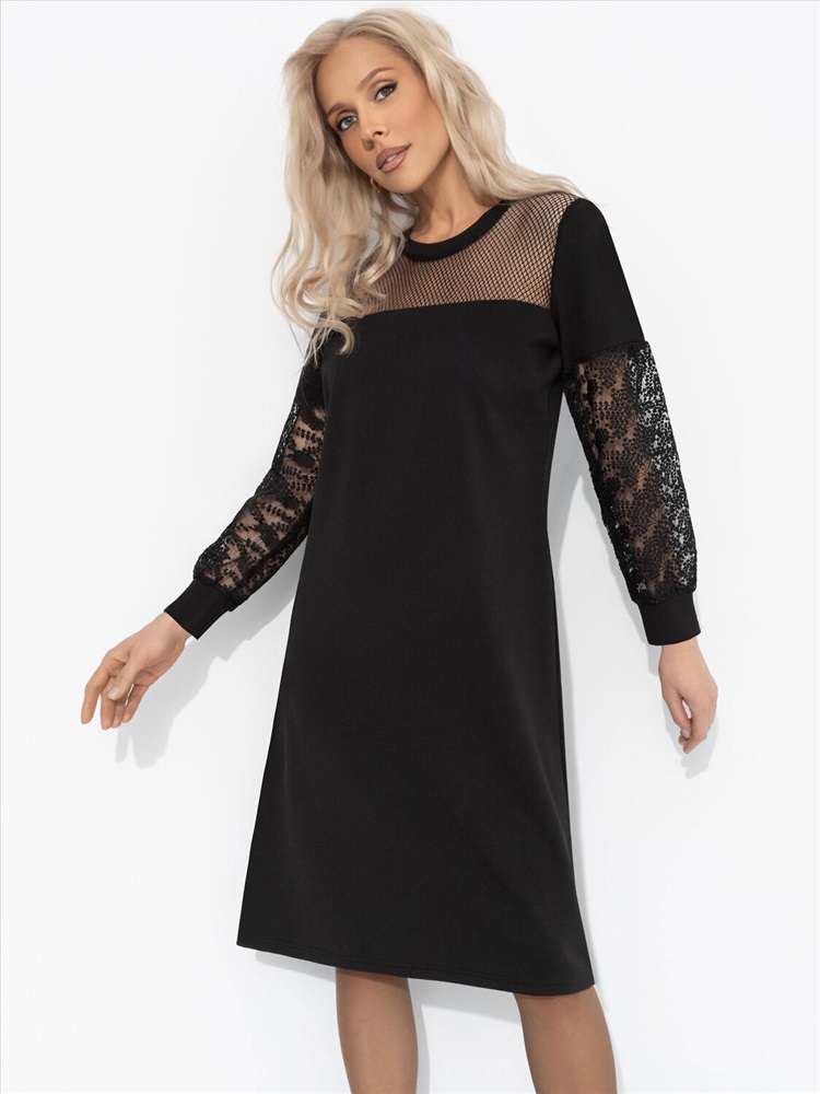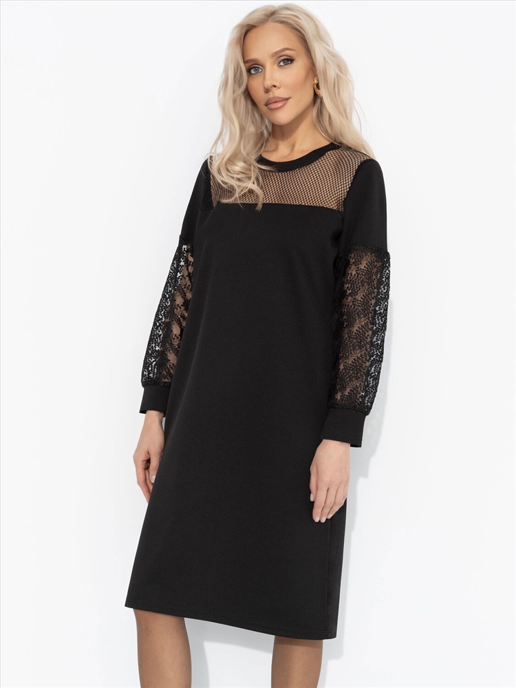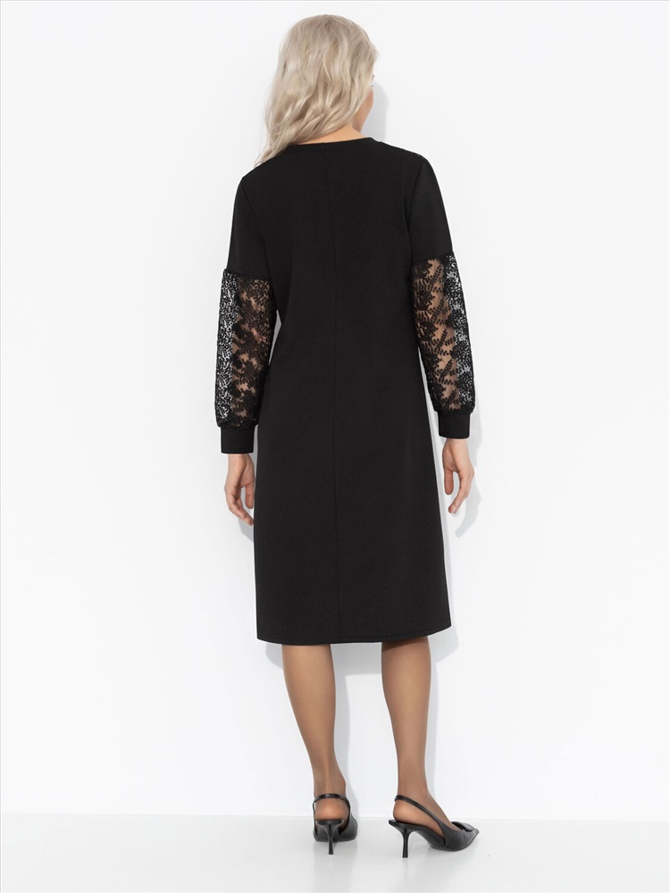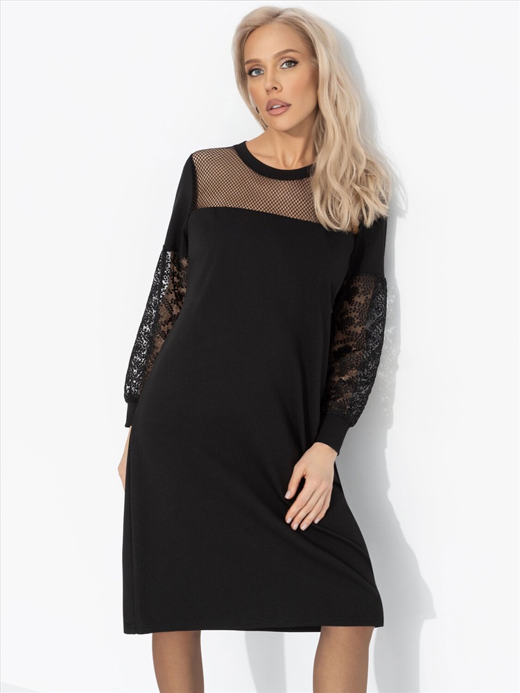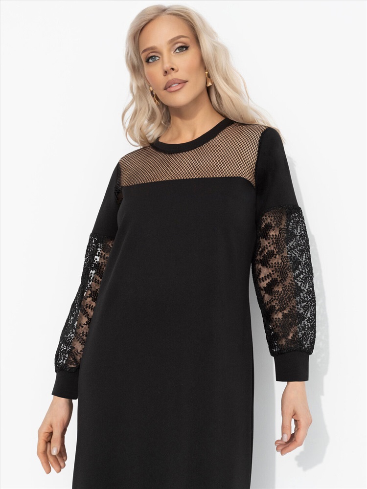 Она отключила телефон. Оставила суету за дверью. Платье из ткани «Диор» с кружевными рукавами мягко ложится по силуэту – и кажется, будто делает ее еще красивее. В отражении зеркала – спокойствие, вкус к жизни и лёгкая интрига. Платье прямого силуэта длины миди с мягкой посадкой по фигуре. Полупрозрачная вставка из сетки и рукава из гипюра-стрейч создают изящный контраст фактур.