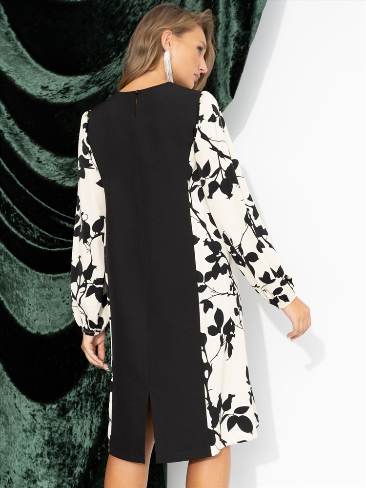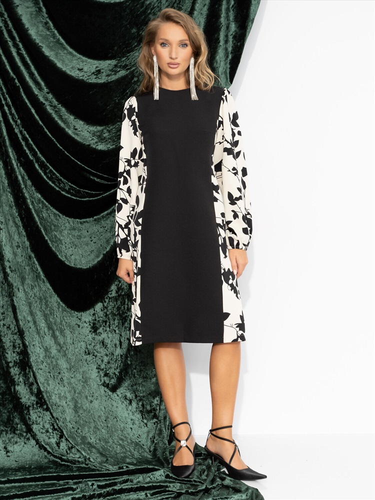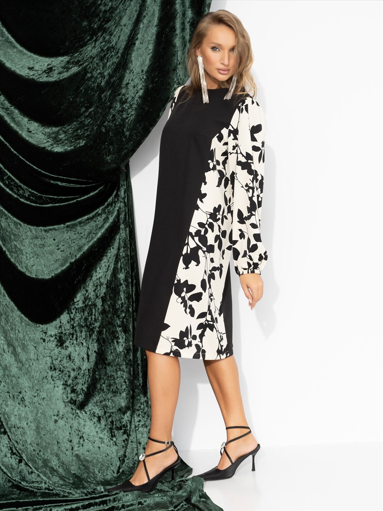 Быть знаменитостью – значит просто быть собой. Шёлк скользит по коже, даря ощущение уверенности. Контраст чёрного и белого создаёт кадр, в котором ты и есть – главный акцент. Платье прямого кроя с разрезом по спинке. Подол асимметричный. Застежка на пуговицу.