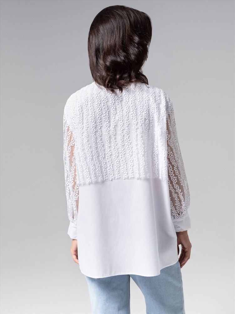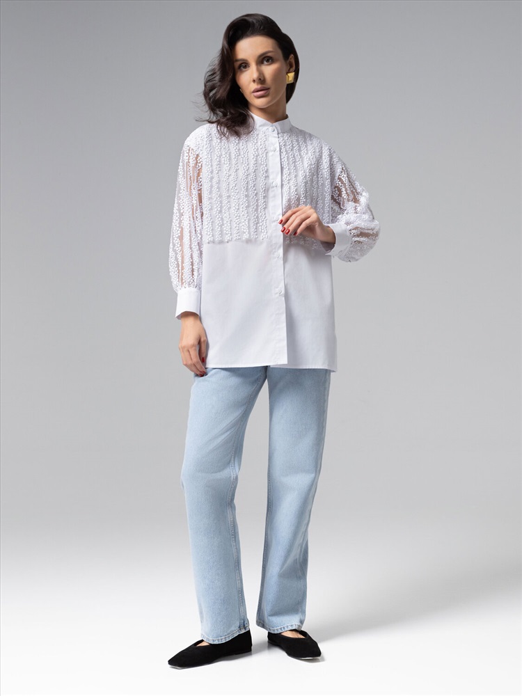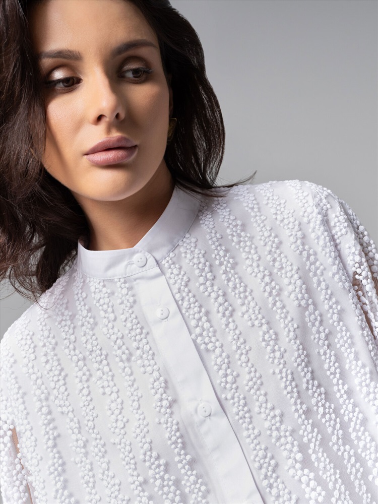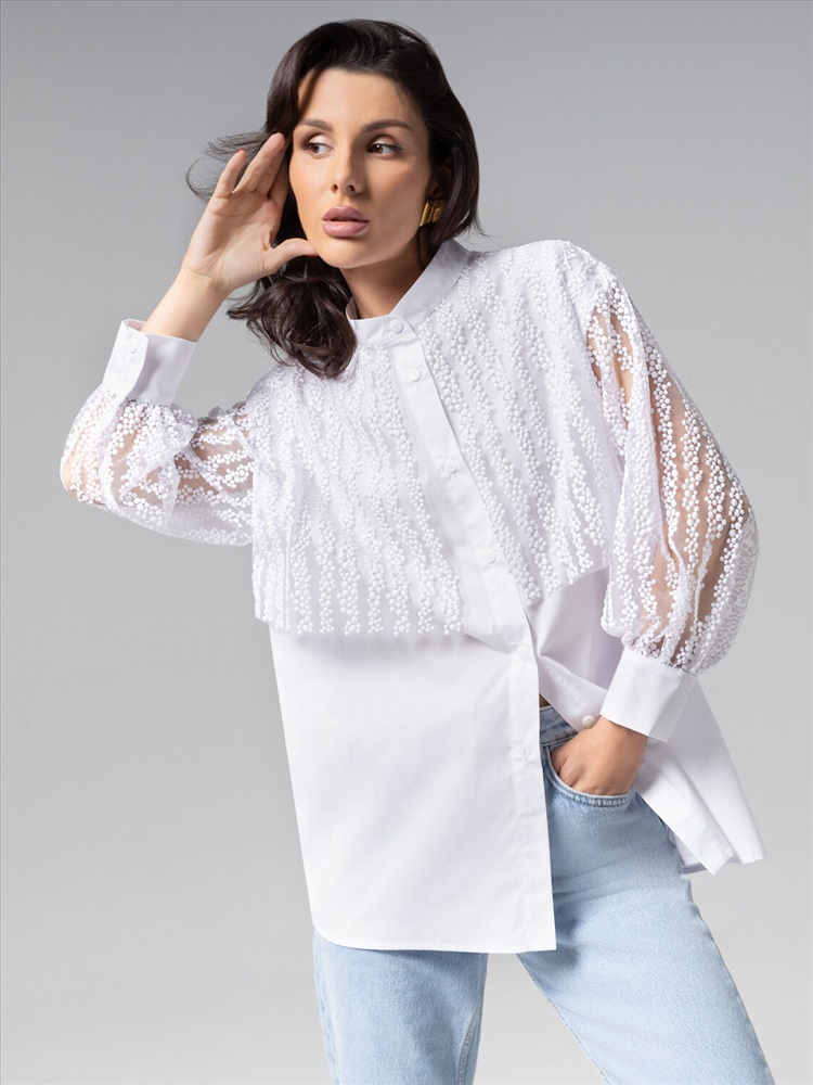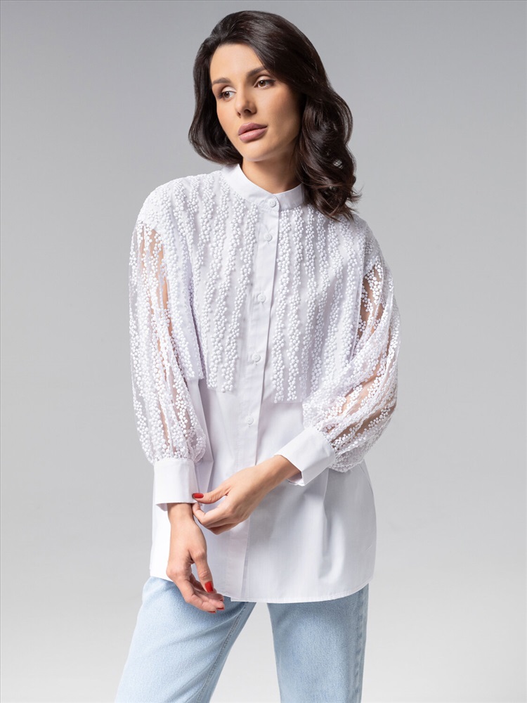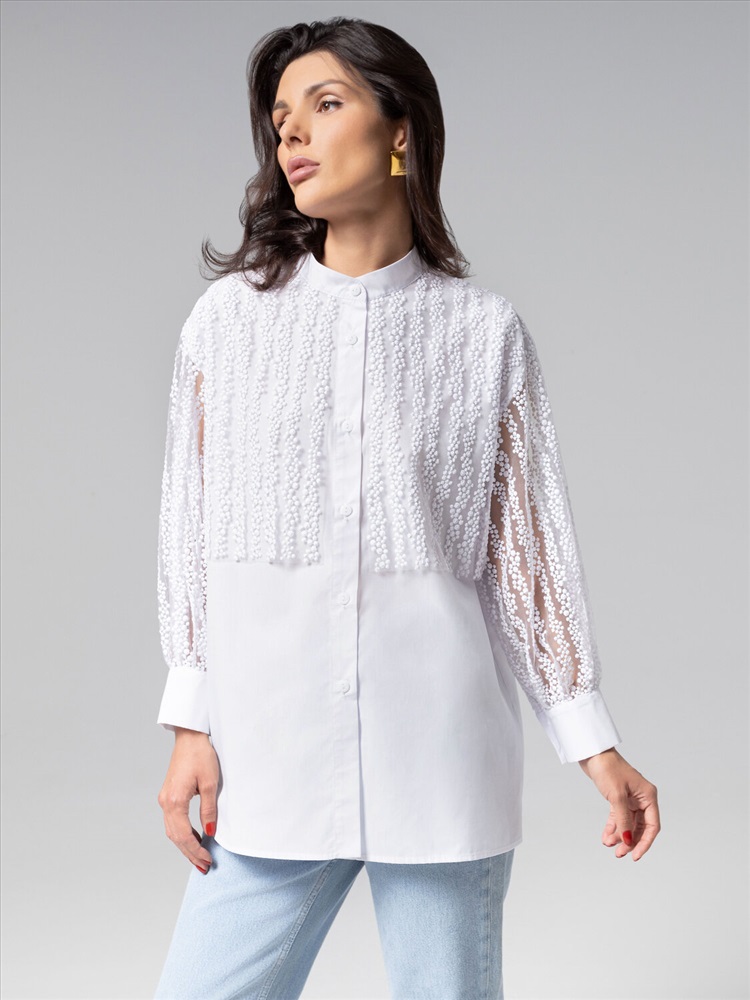 Производитель: CHARUTTI; Российский размер: 46; Обхват груди: 92; Обхват талии: 74; Обхват бедер: 98; Артикул поставщика: 12036; Ткань: Рубашечная ткань поплин "тиси", вышивка на сетке; Состав: 50% хлопок, 50% полиэстер; Год: 2025; Страна: Россия; Рост: 164-170
