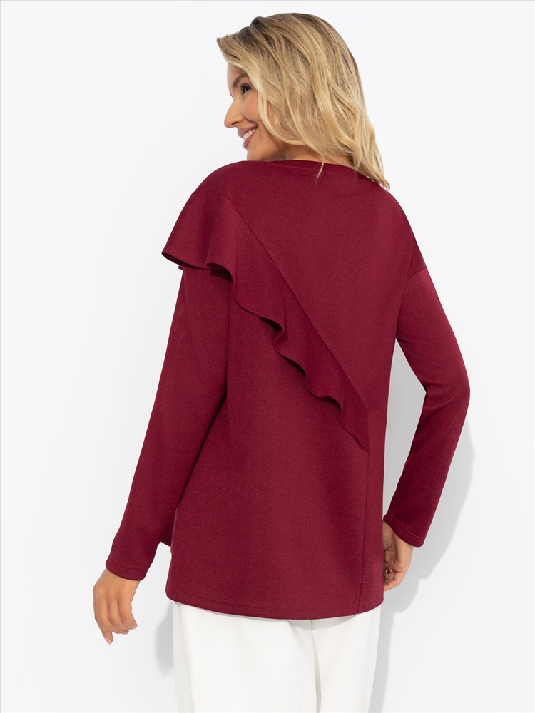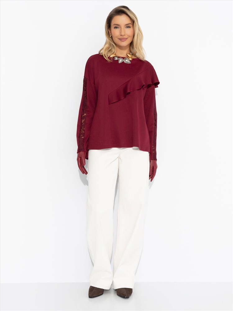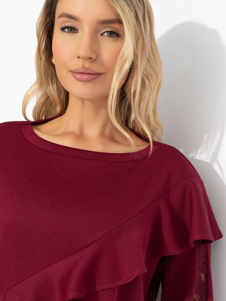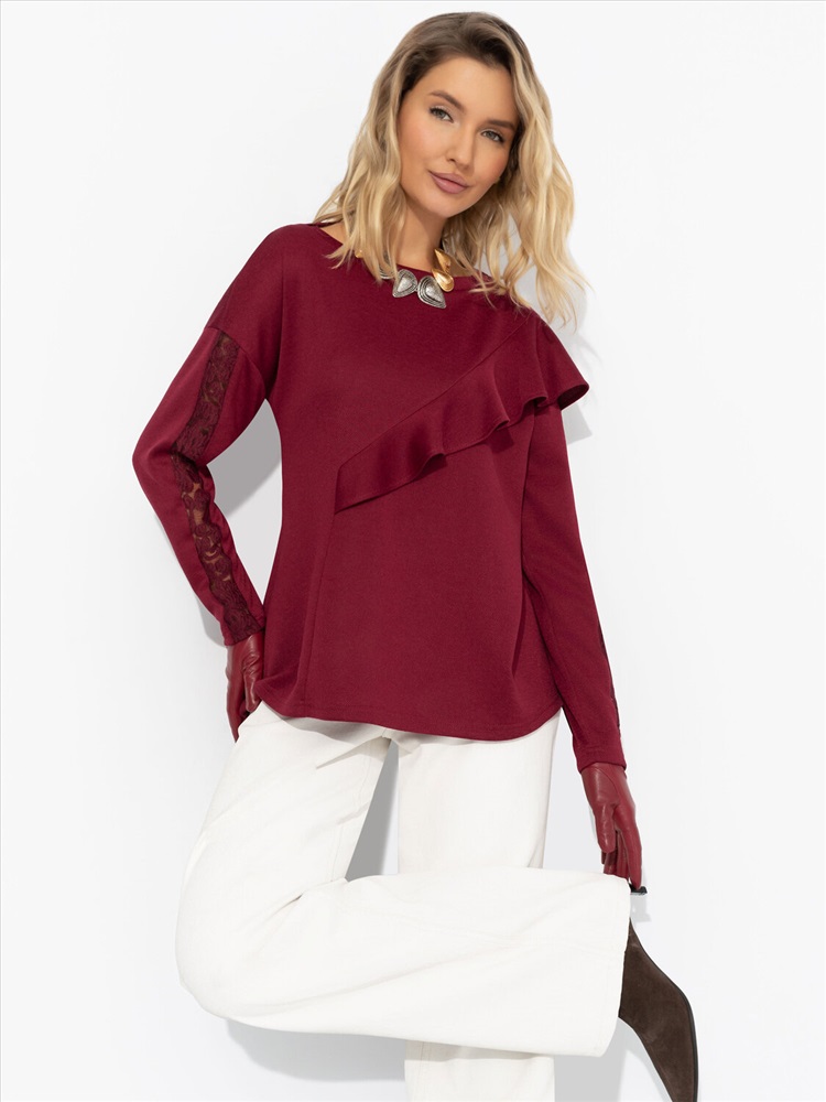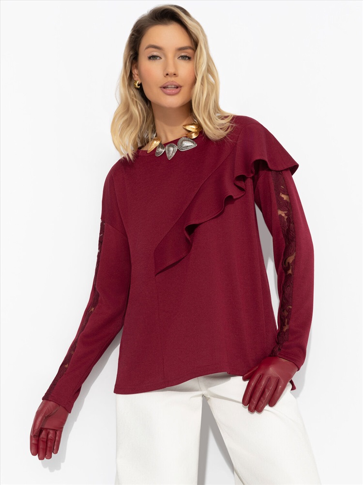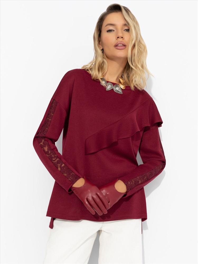Ваш талисман на прохладное время года от ЧАРУТТИ. Глубокий винный цвет, акцентный крой изделия и шлейф женственности, обычно не свойственный столь комфортным изделиям. Туника ЧАРУТТИ создана для теплых объятий. Туника прямого силуэта. Объемный декор в виде рюш по центральной части изделия. Тонкая вставка кружева в тон изделия по рукавам.